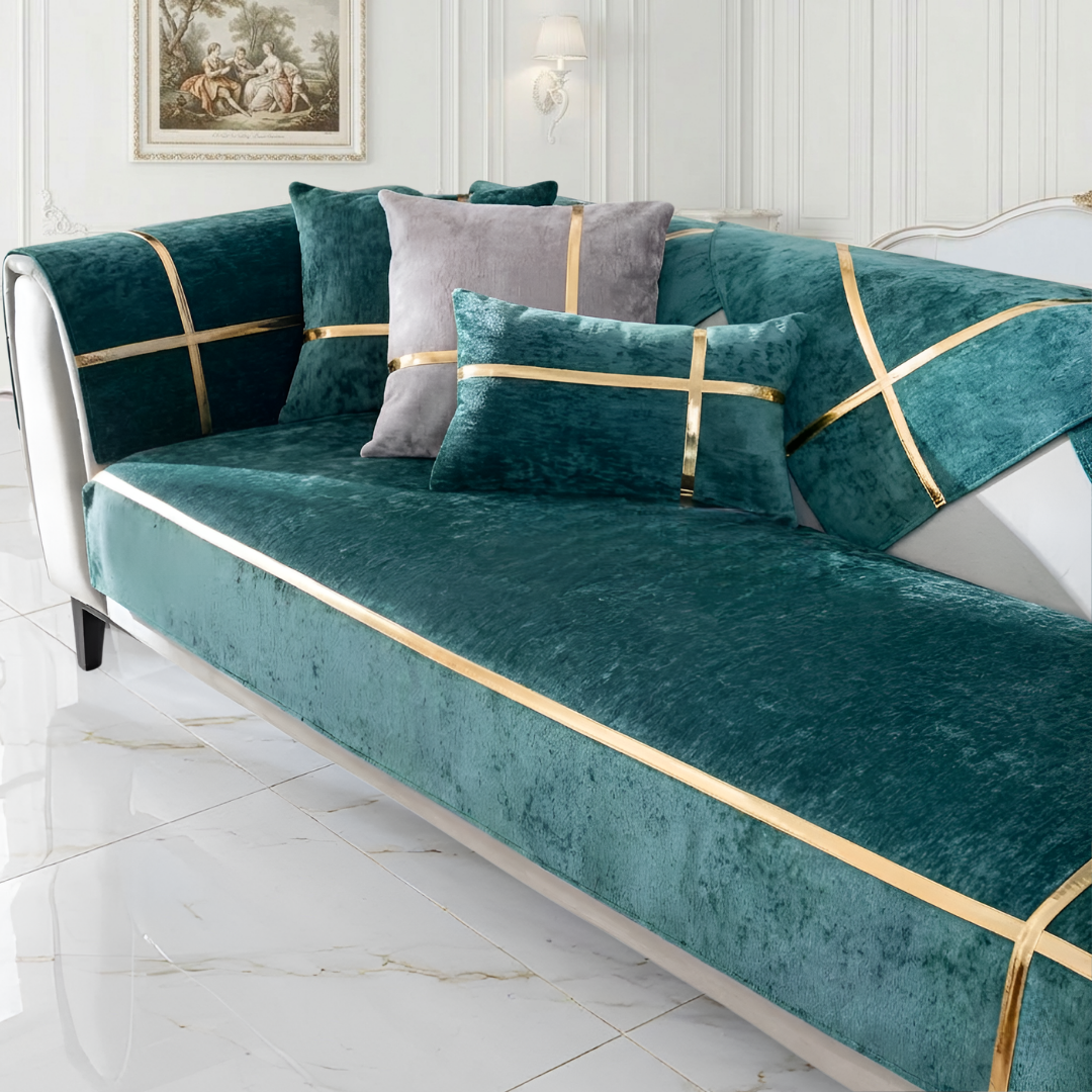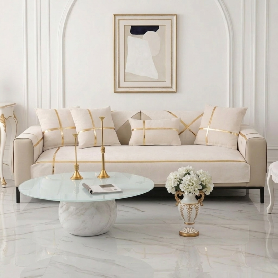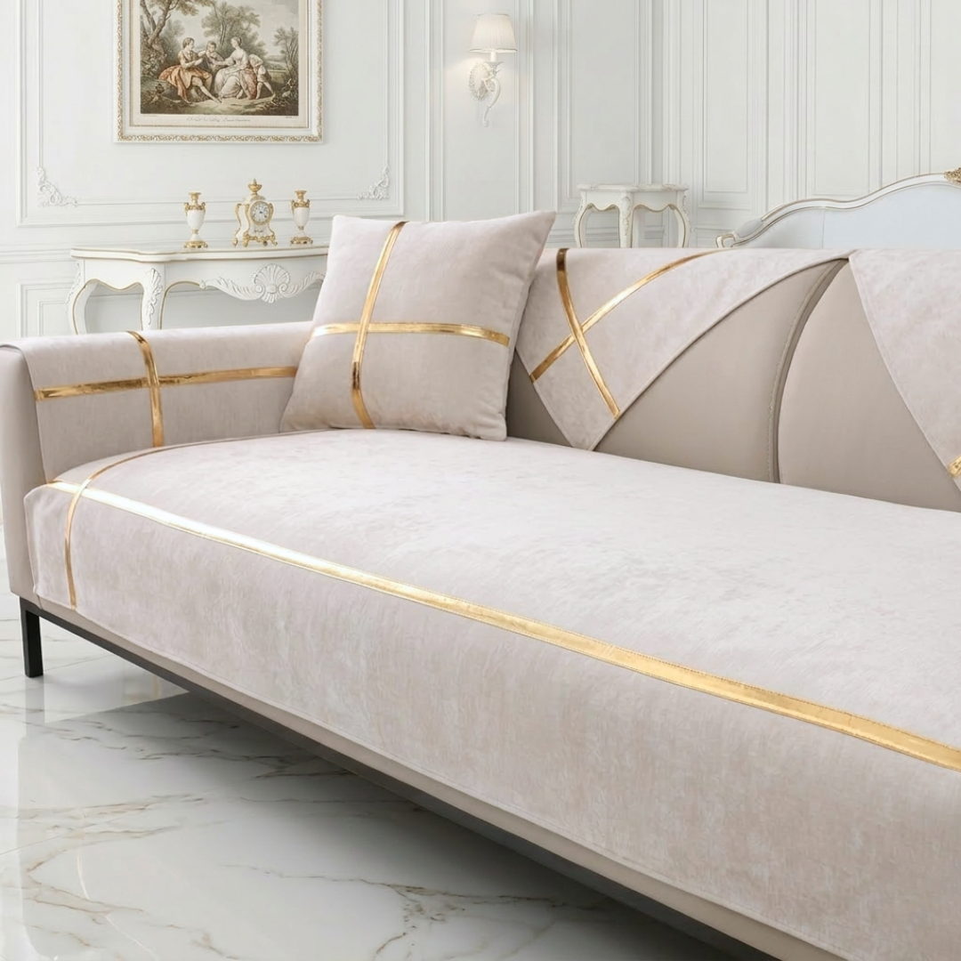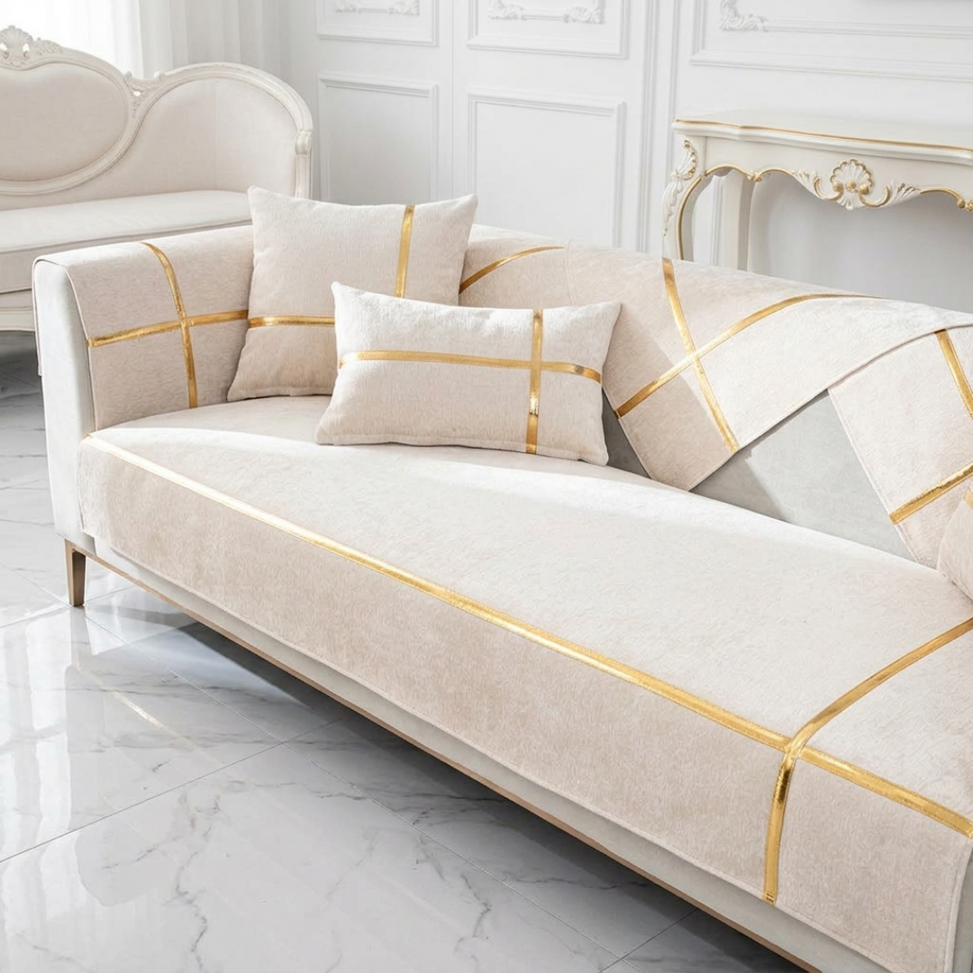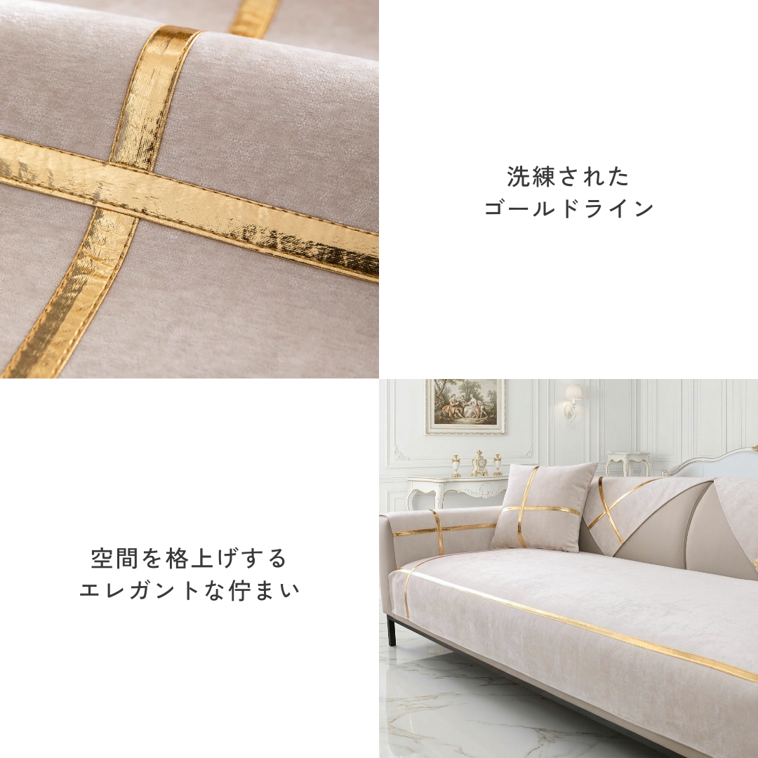 洗練された光沢のゴールドラインが印象的な、ホテルライクなカスタムソファカバー。