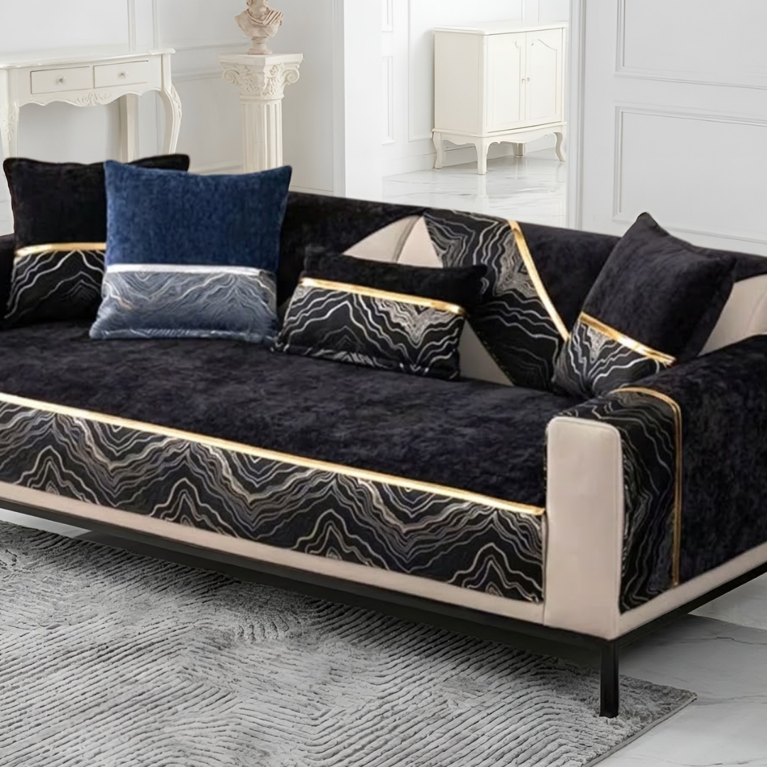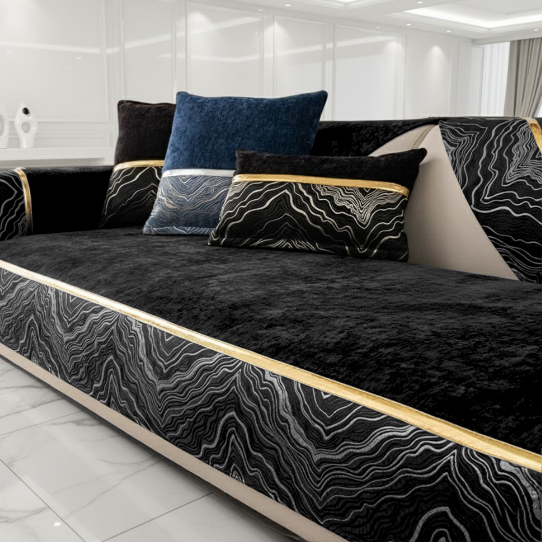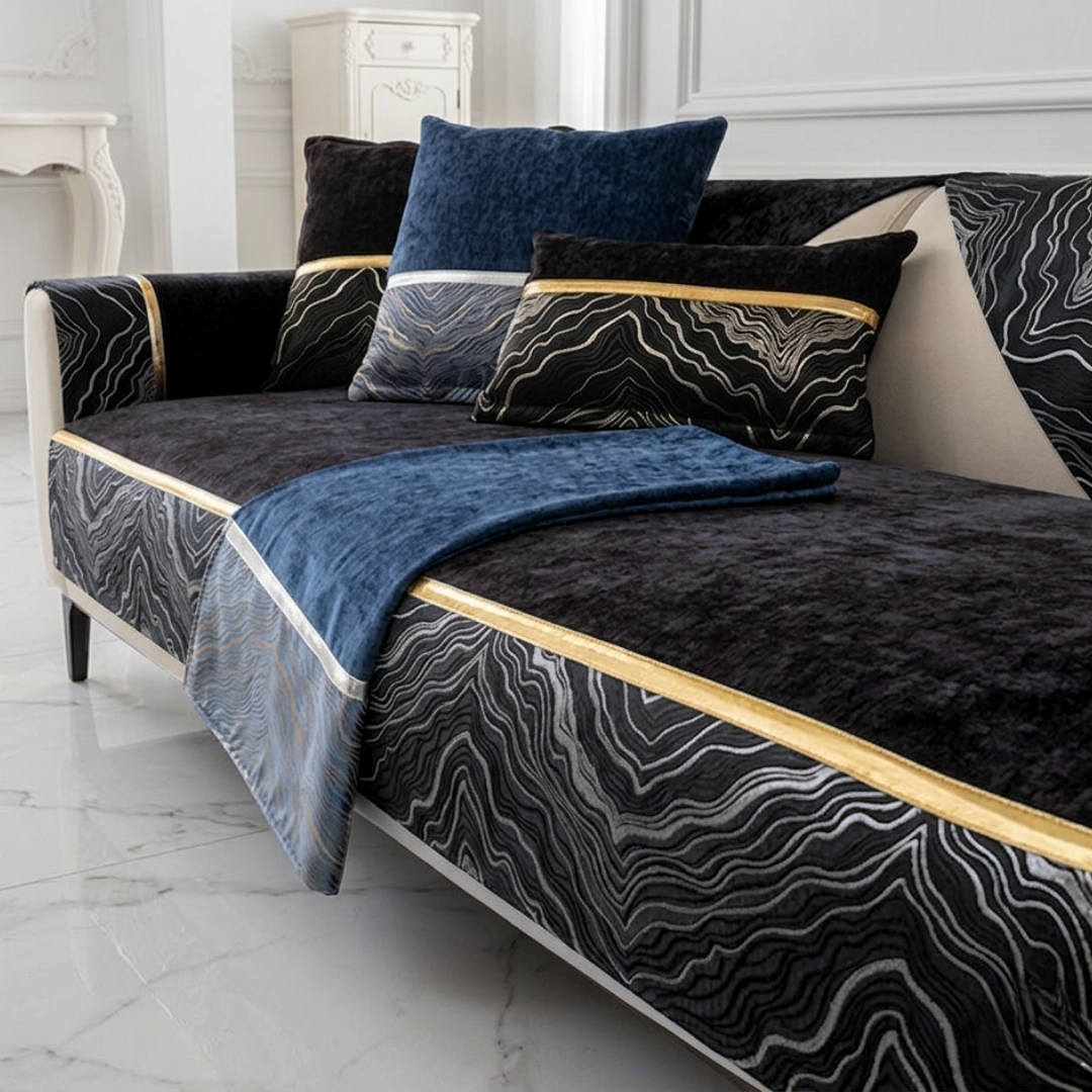流れるような模様と光沢ラインが印象的な、ラグジュアリーなカスタムソファカバー。