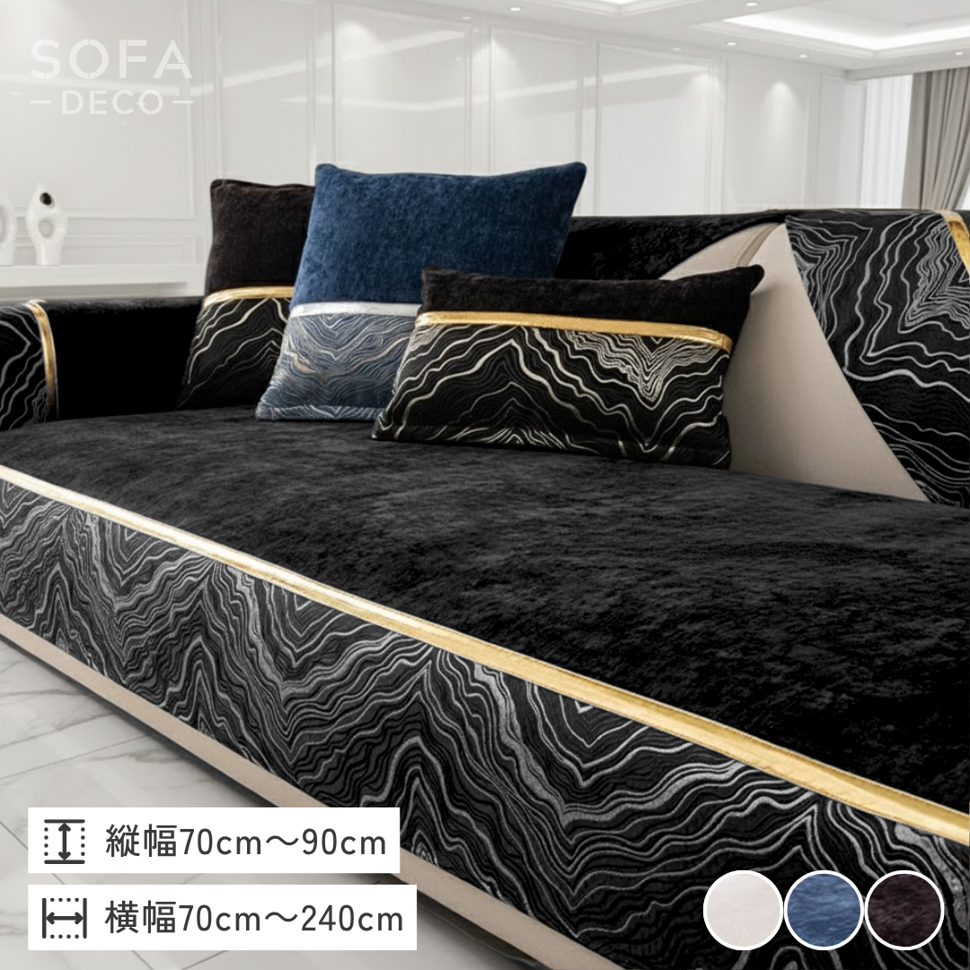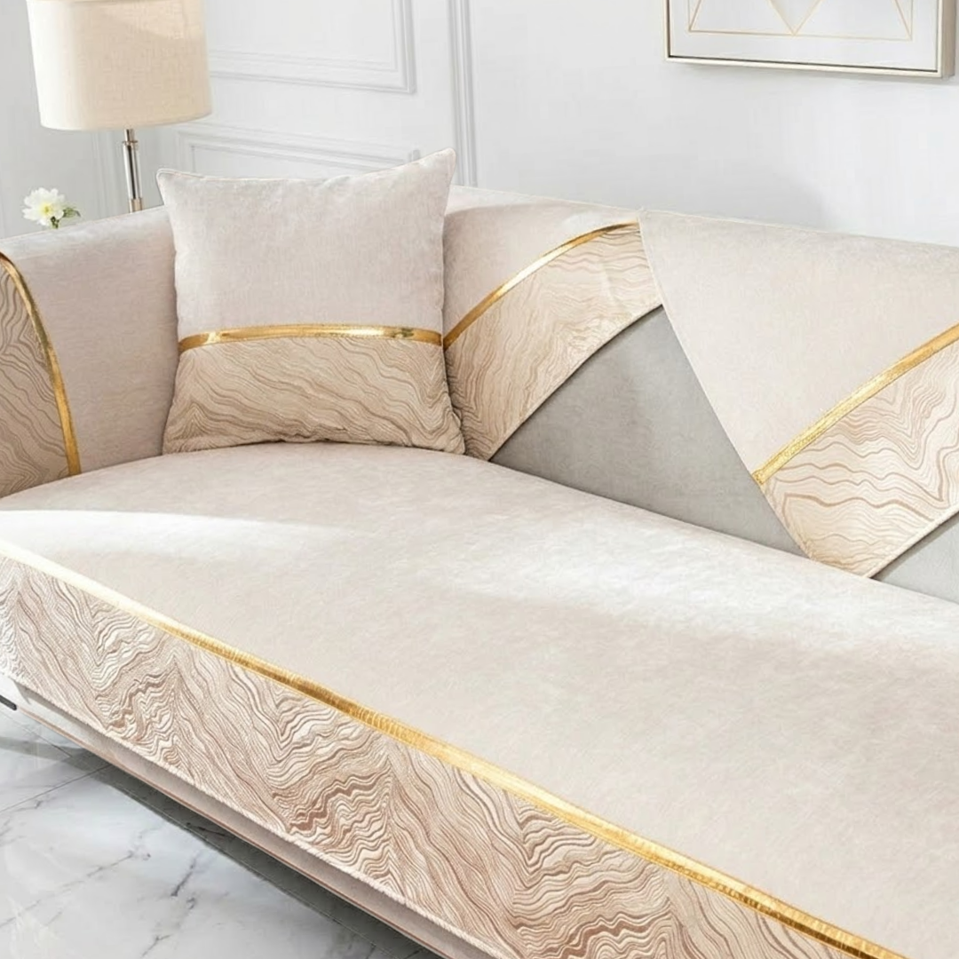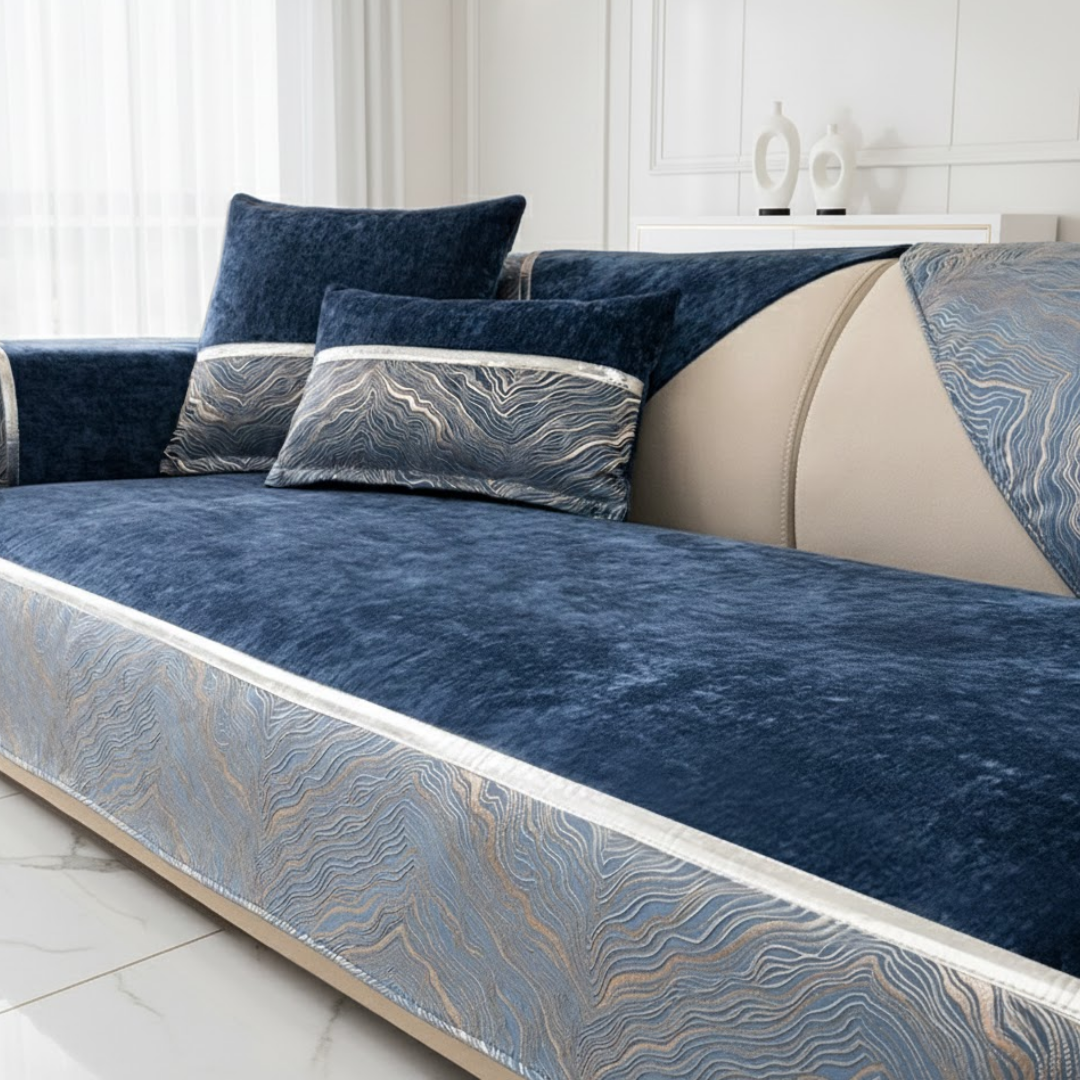 流れるような模様と光沢ラインが印象的な、ラグジュアリーなカスタムソファカバー。