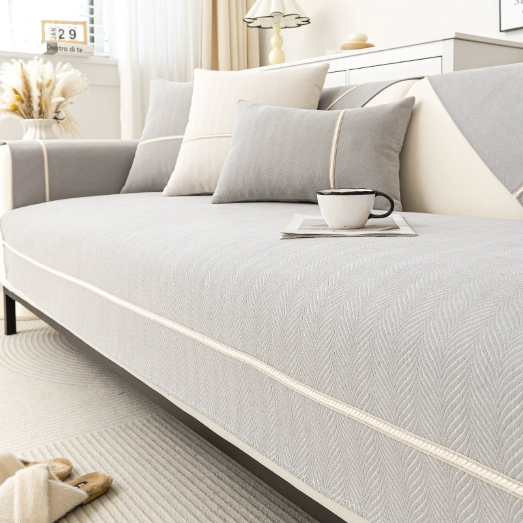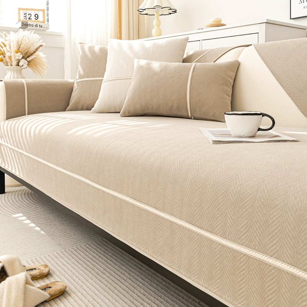 穏やかな光を受けて浮かび上がる、繊細なヘリンボーン柄が魅力のソファカバー。