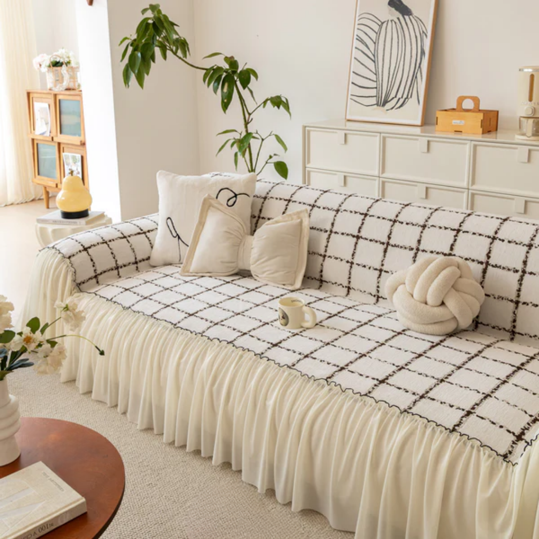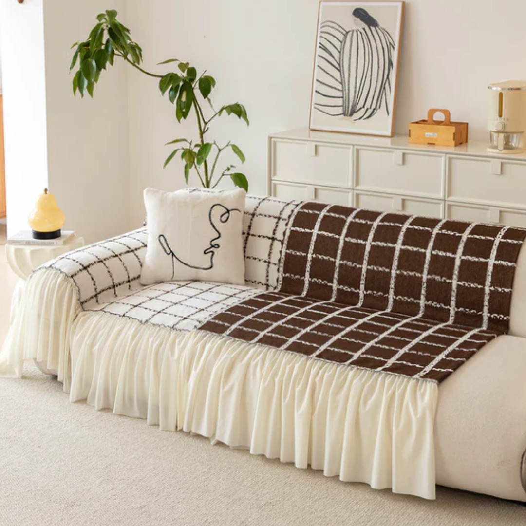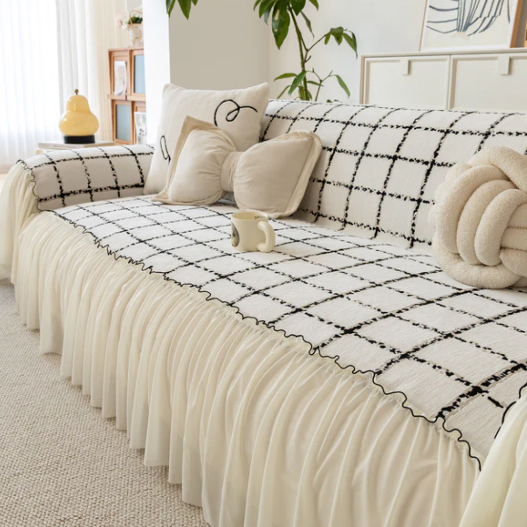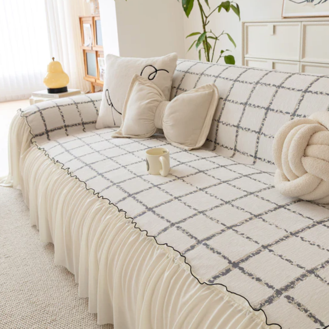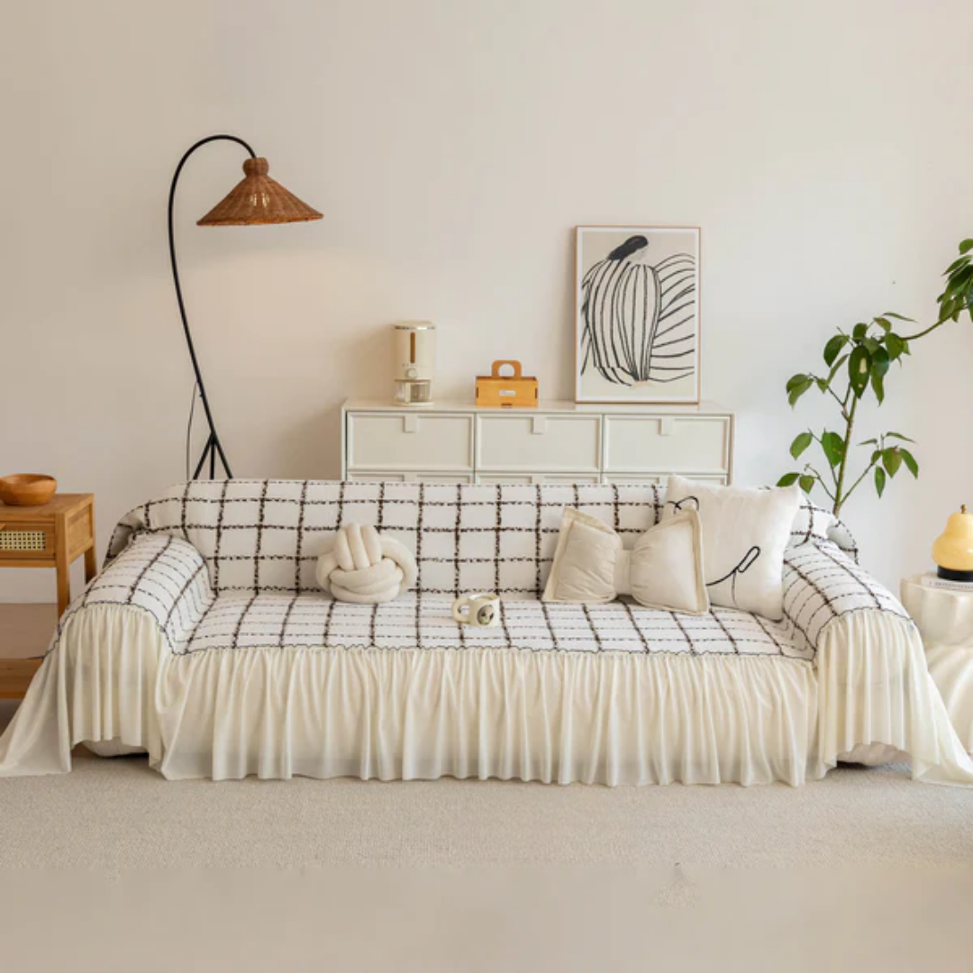 ナチュラルフリルチェックソファカバー