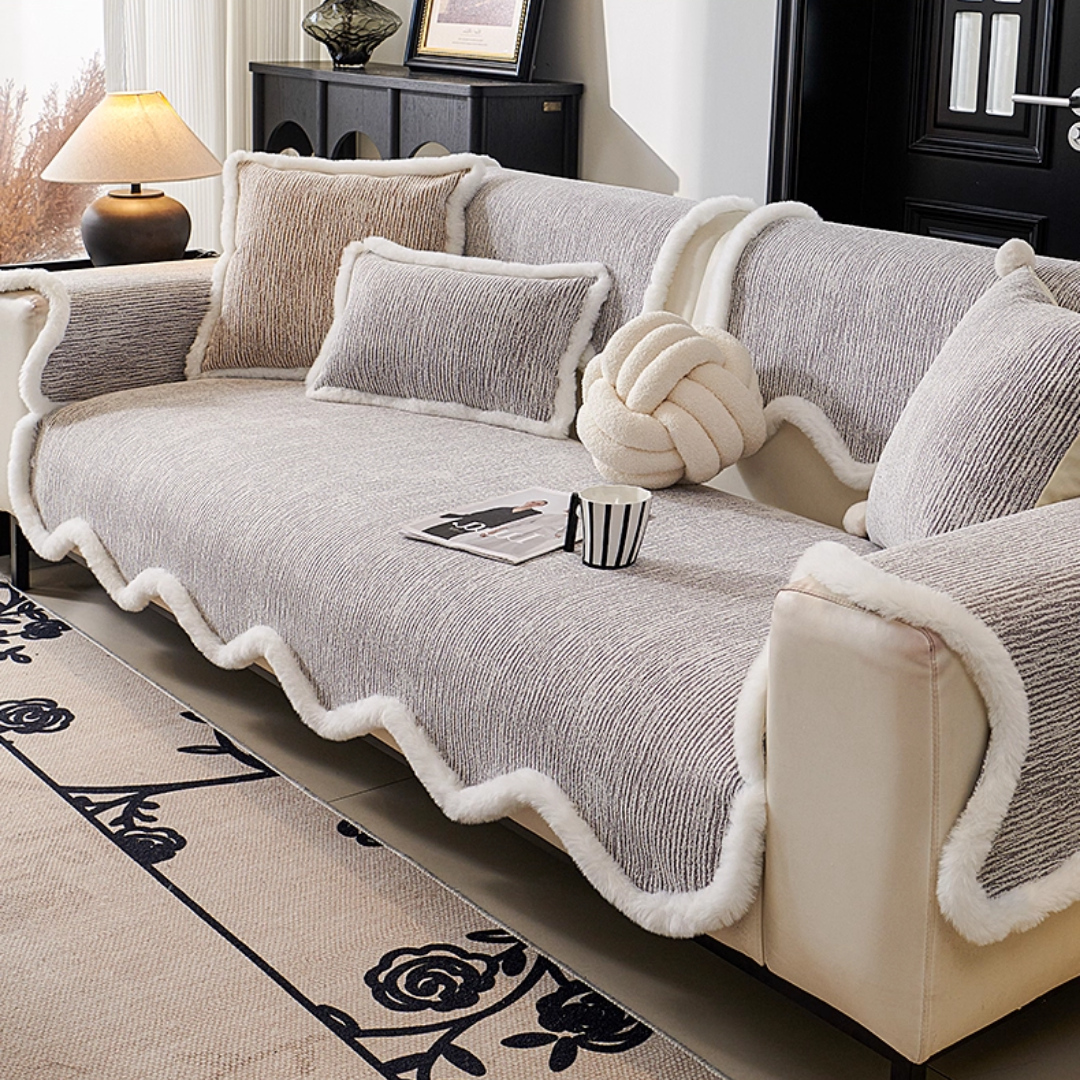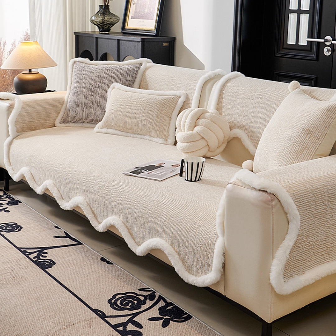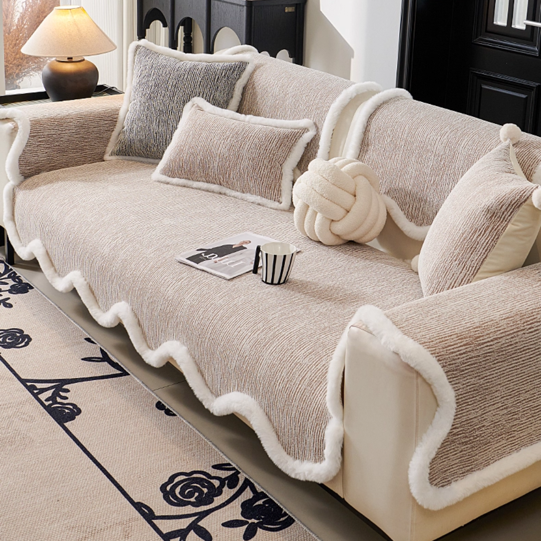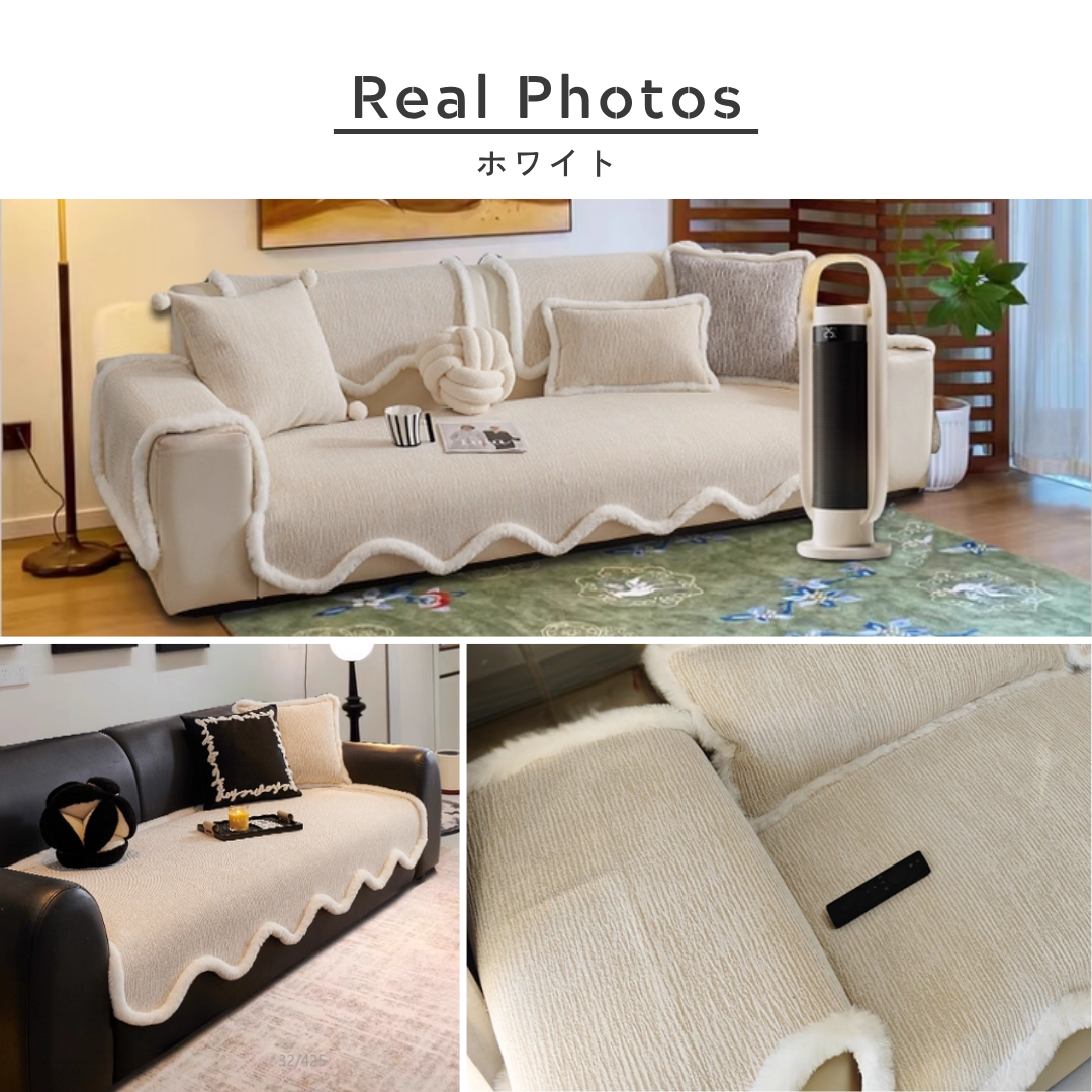 ふっくらとしたファーの縁取りが印象的な、韓国風ソファーカバー。