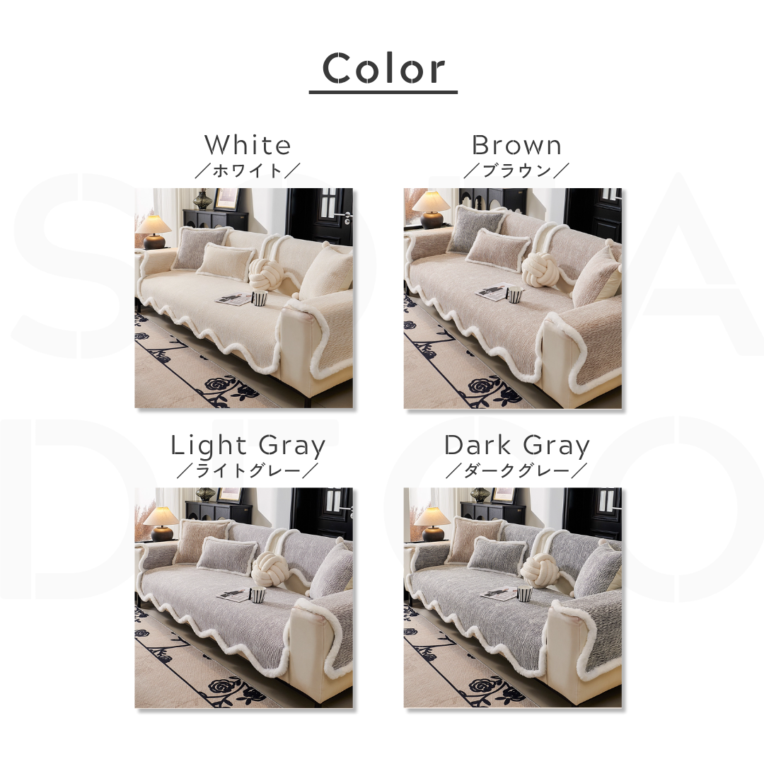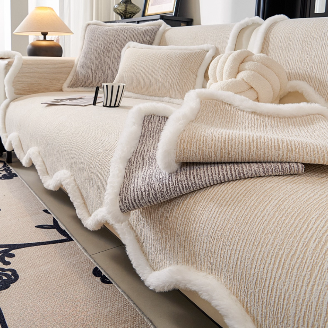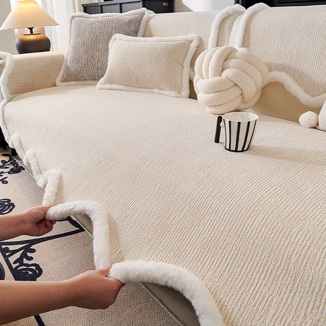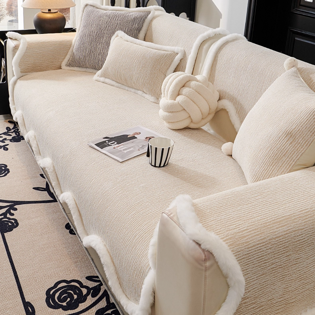 ふっくらとしたファーの縁取りが印象的な、韓国風ソファーカバー。