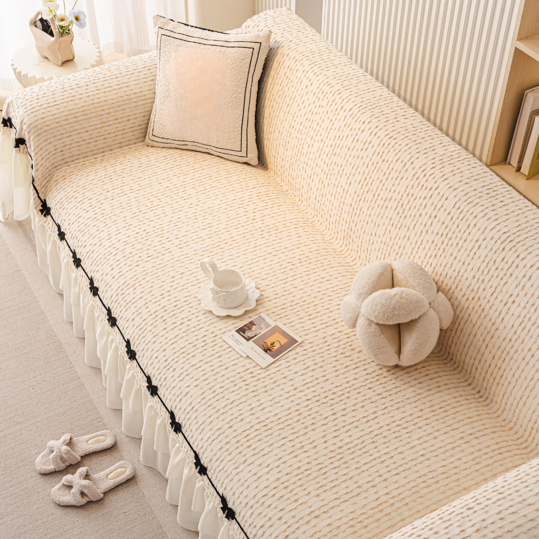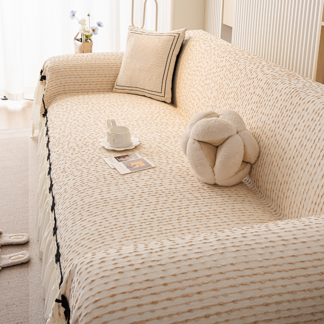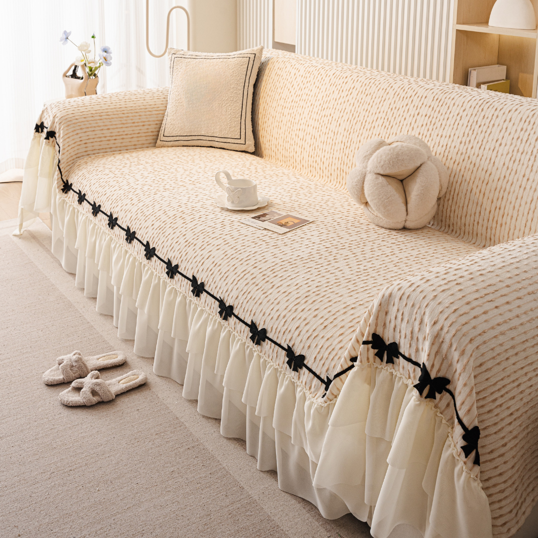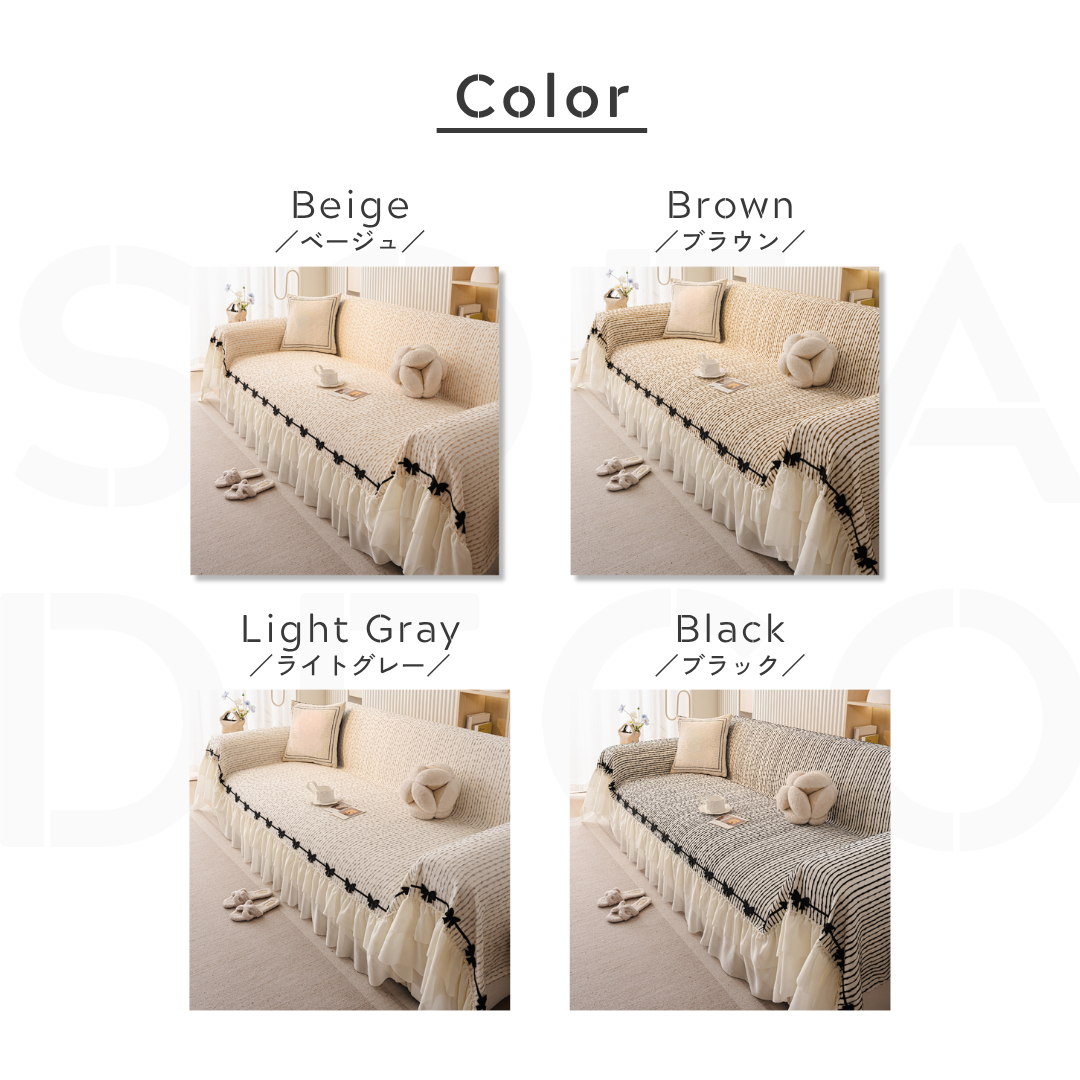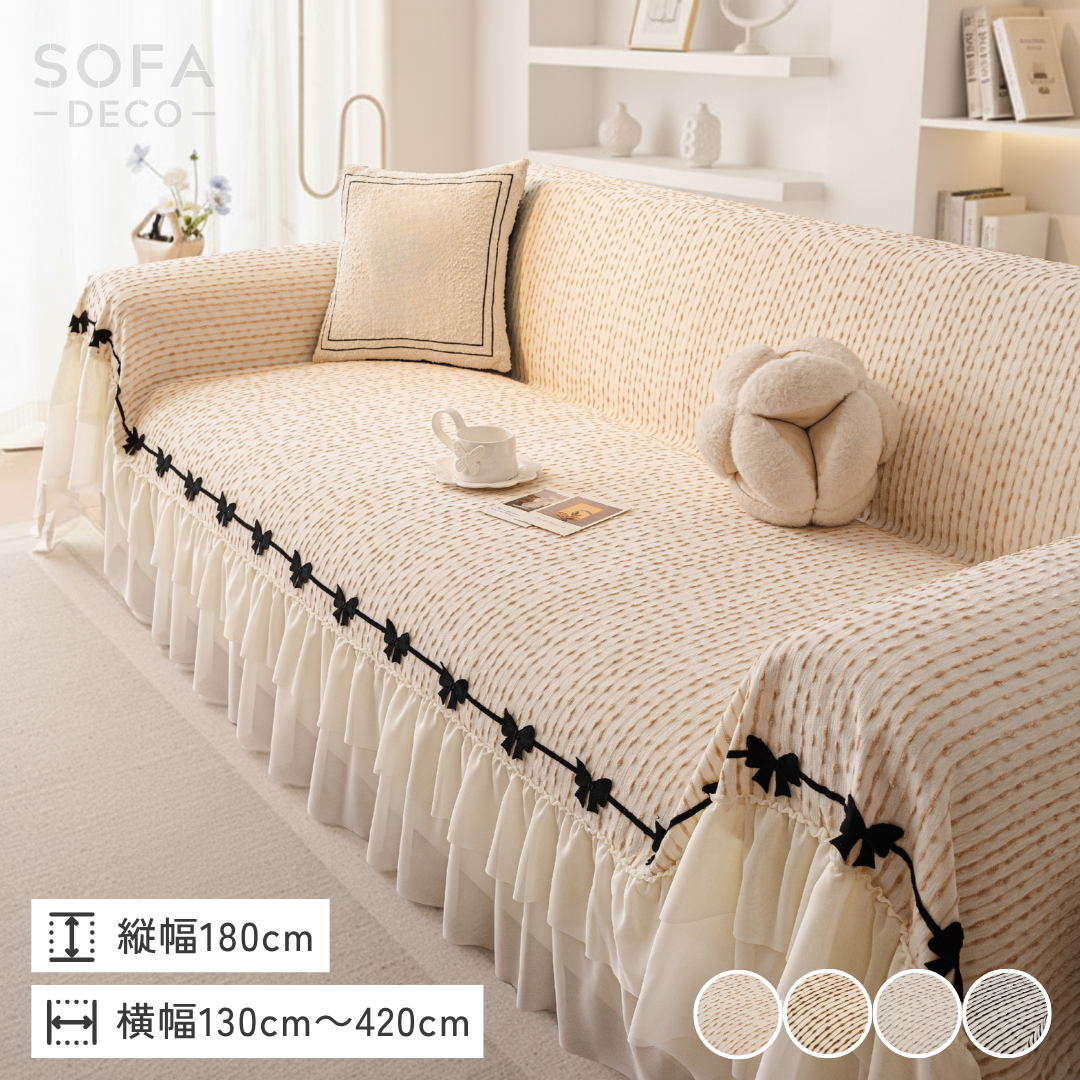 上品なリボンとフリルが印象的な、フェミニンテイストのソファカバー。