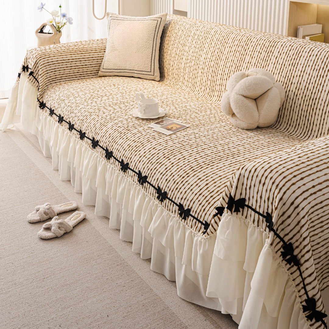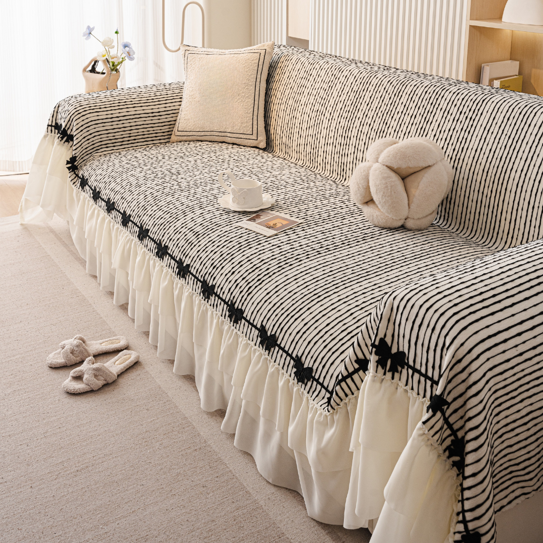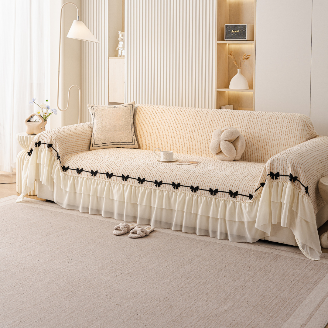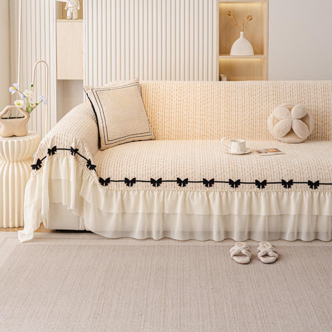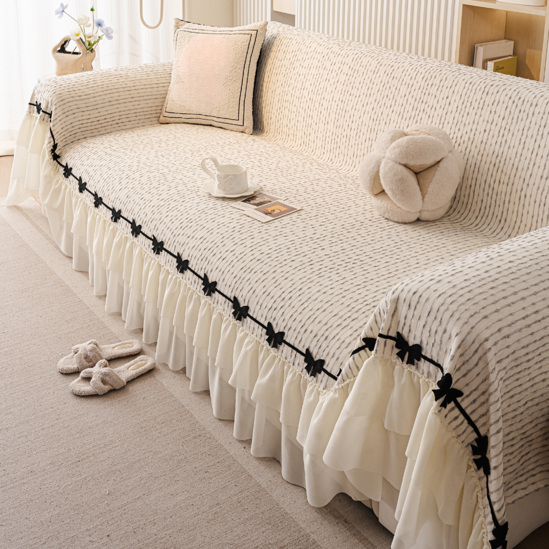 上品なリボンとフリルが印象的な、フェミニンテイストのソファカバー。