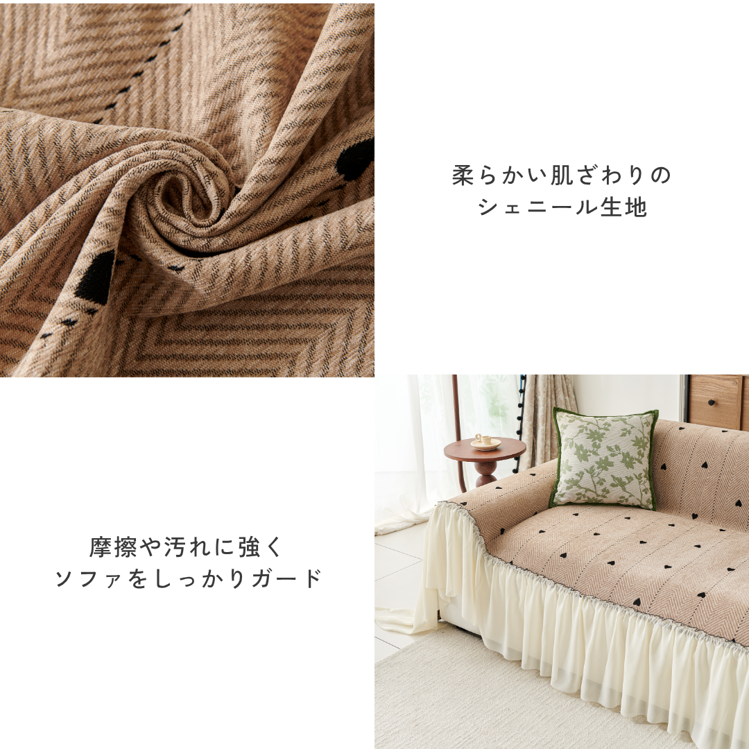 柔らかなシェニール生地で心地よい肌ざわりを実現し、ソファをしっかりと保護します。