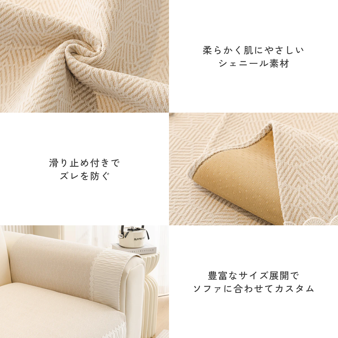 柔らかく肌にやさしいシェニール素材を使用し、裏面の滑り止めがズレを防いで快適にお使いいただけます。