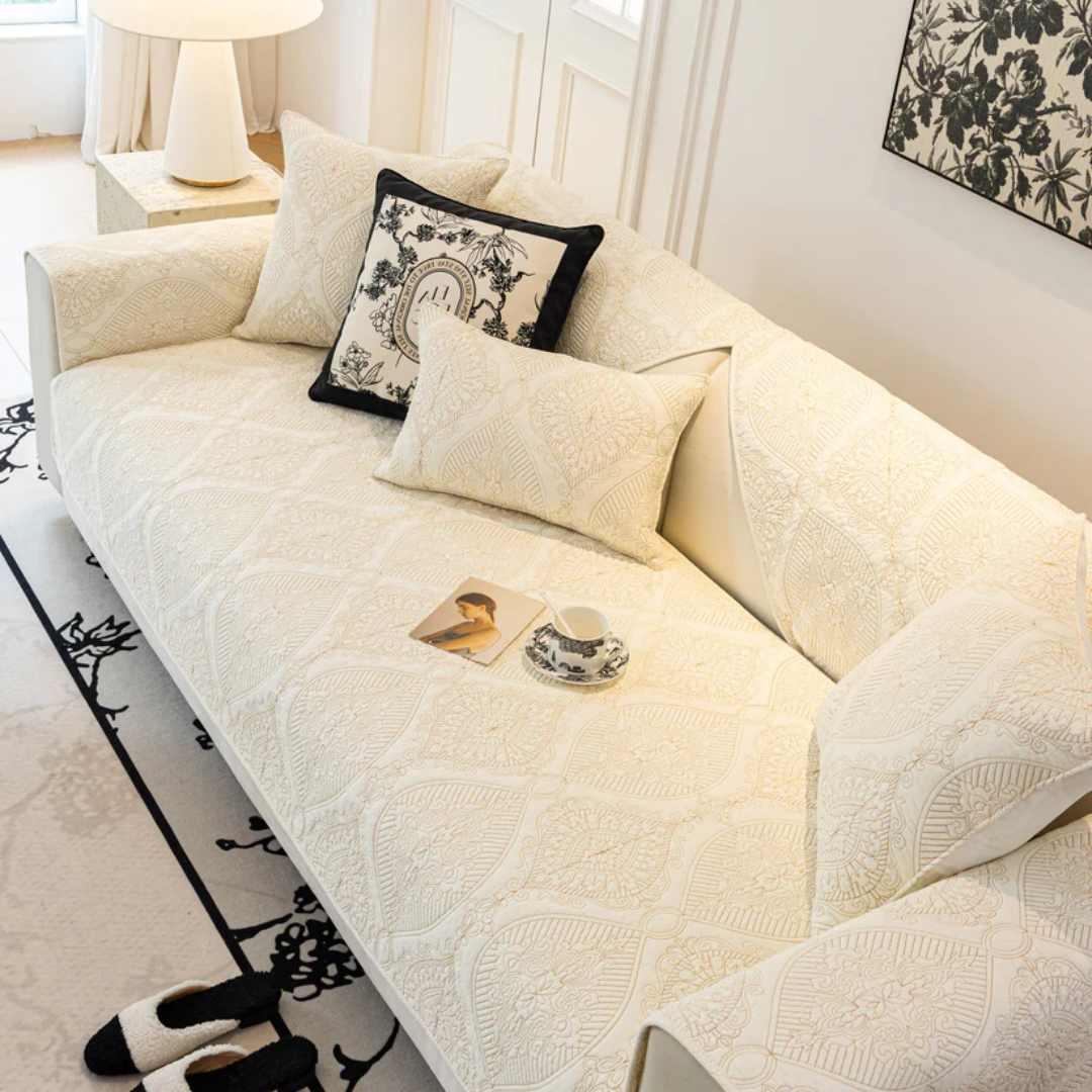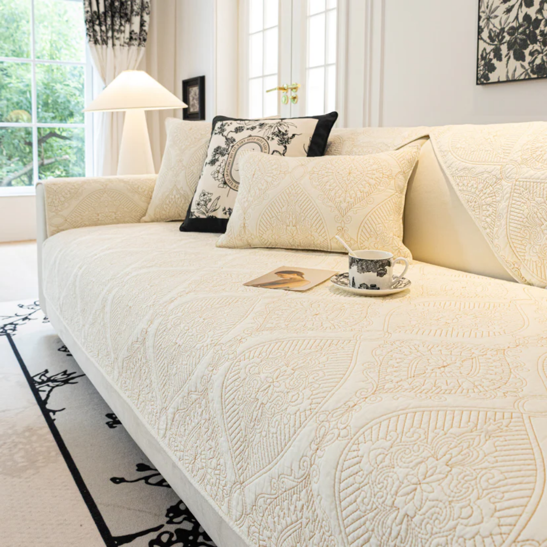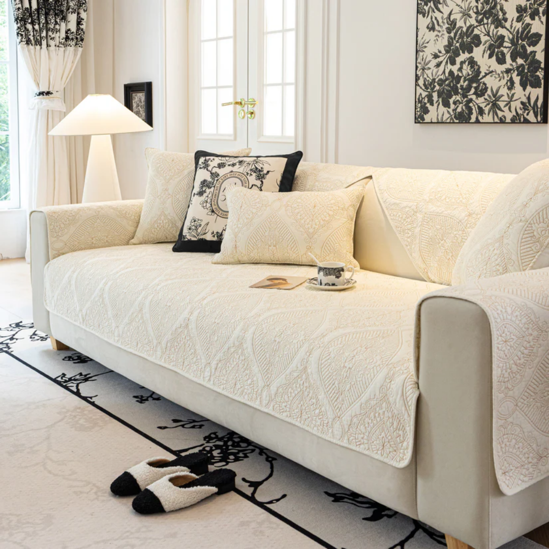 気品ある佇まいと繊細なステッチ模様が映える、高級感のあるカスタムソファカバー。