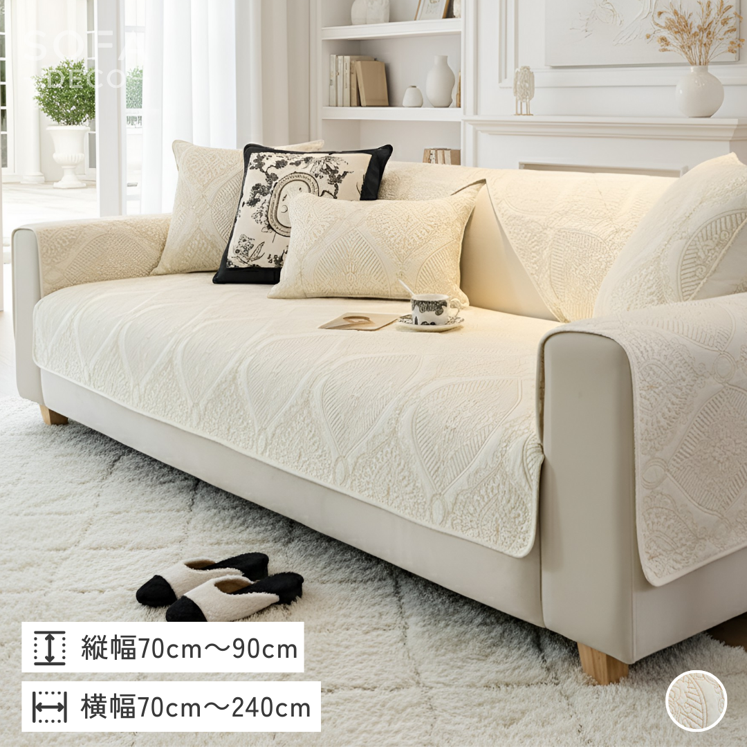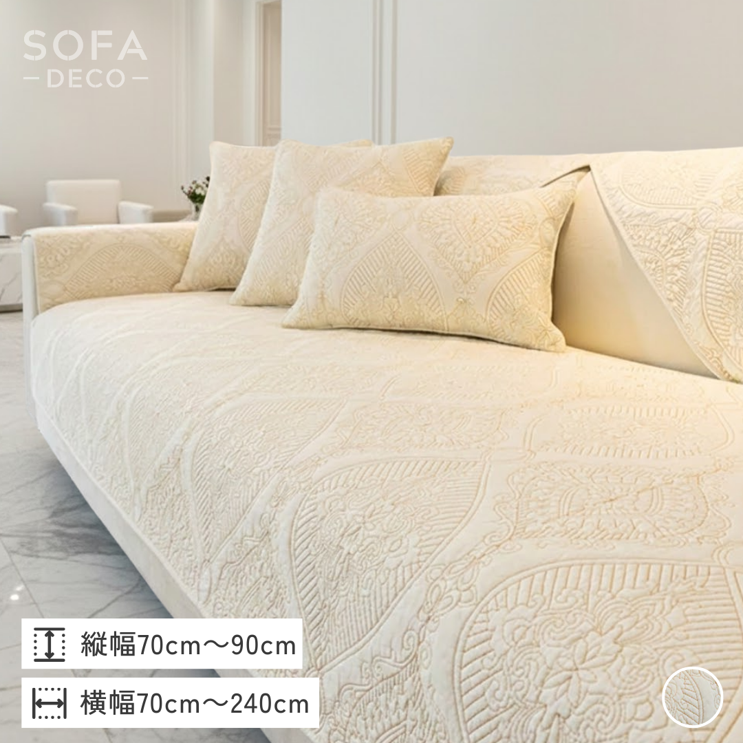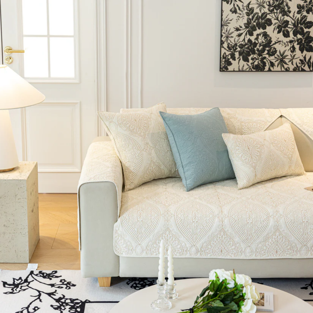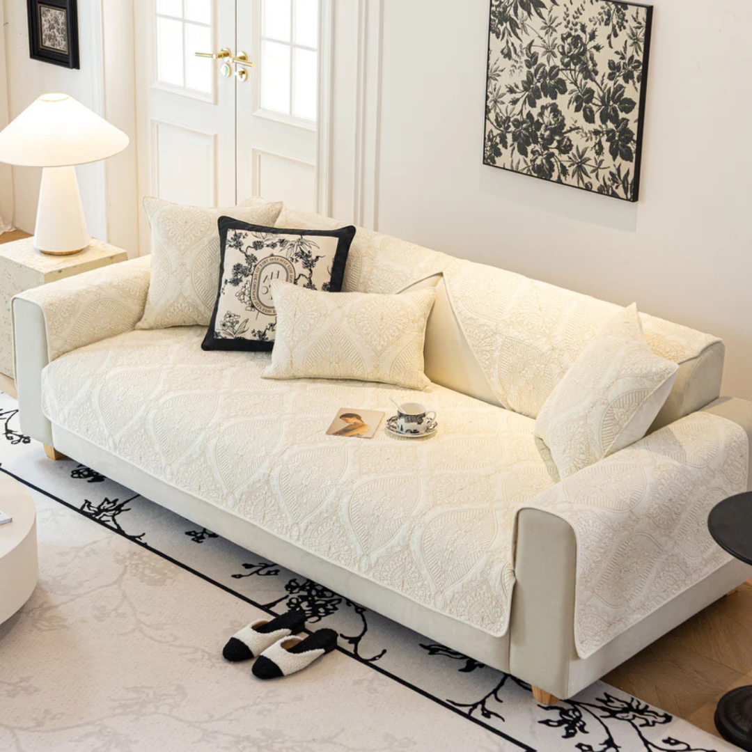 気品ある佇まいと繊細なステッチ模様が映える、高級感のあるカスタムソファカバー。