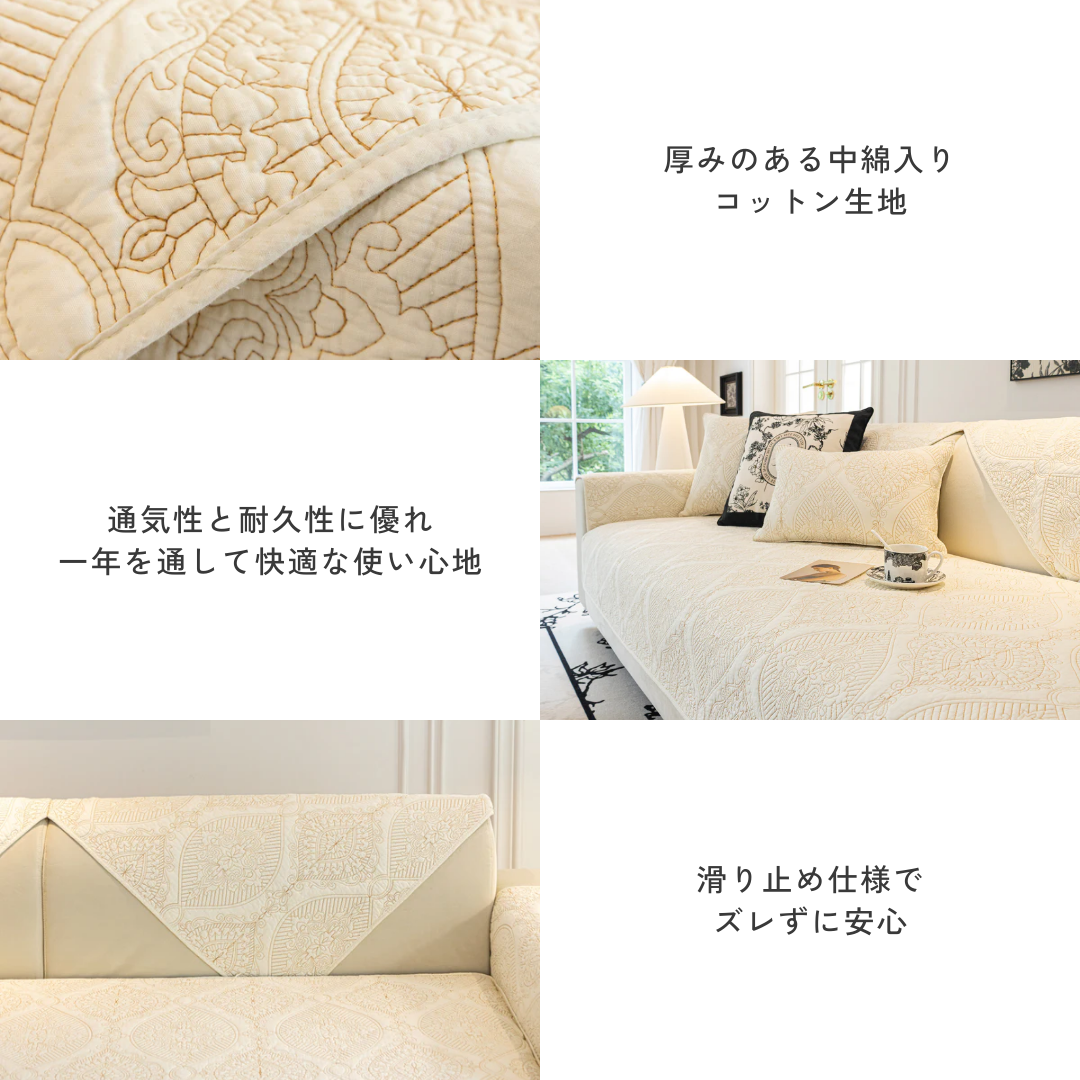裏面は滑り止め仕様でズレにくく、複数枚を組み合わせながらソファの形に合わせて美しくお使いいただけます。