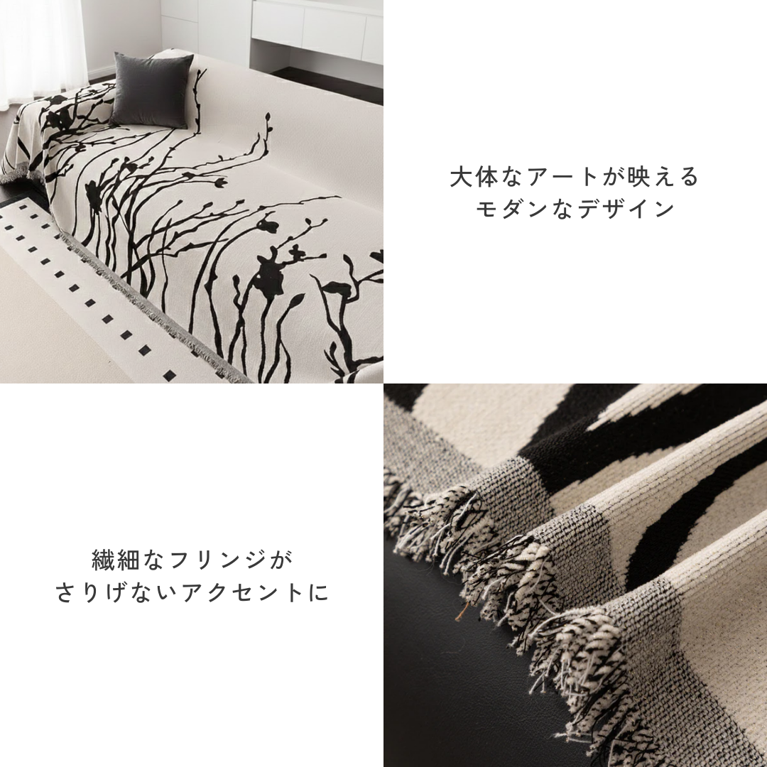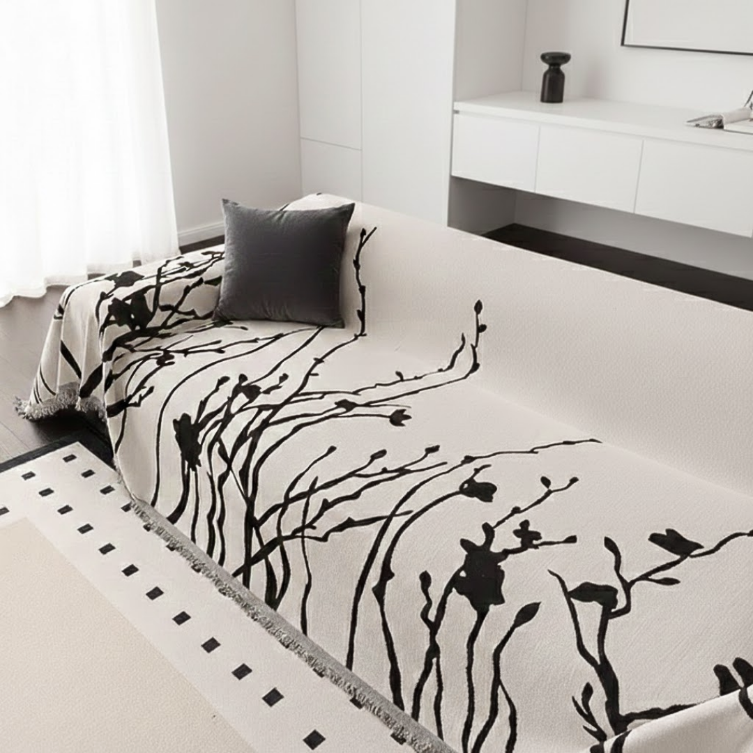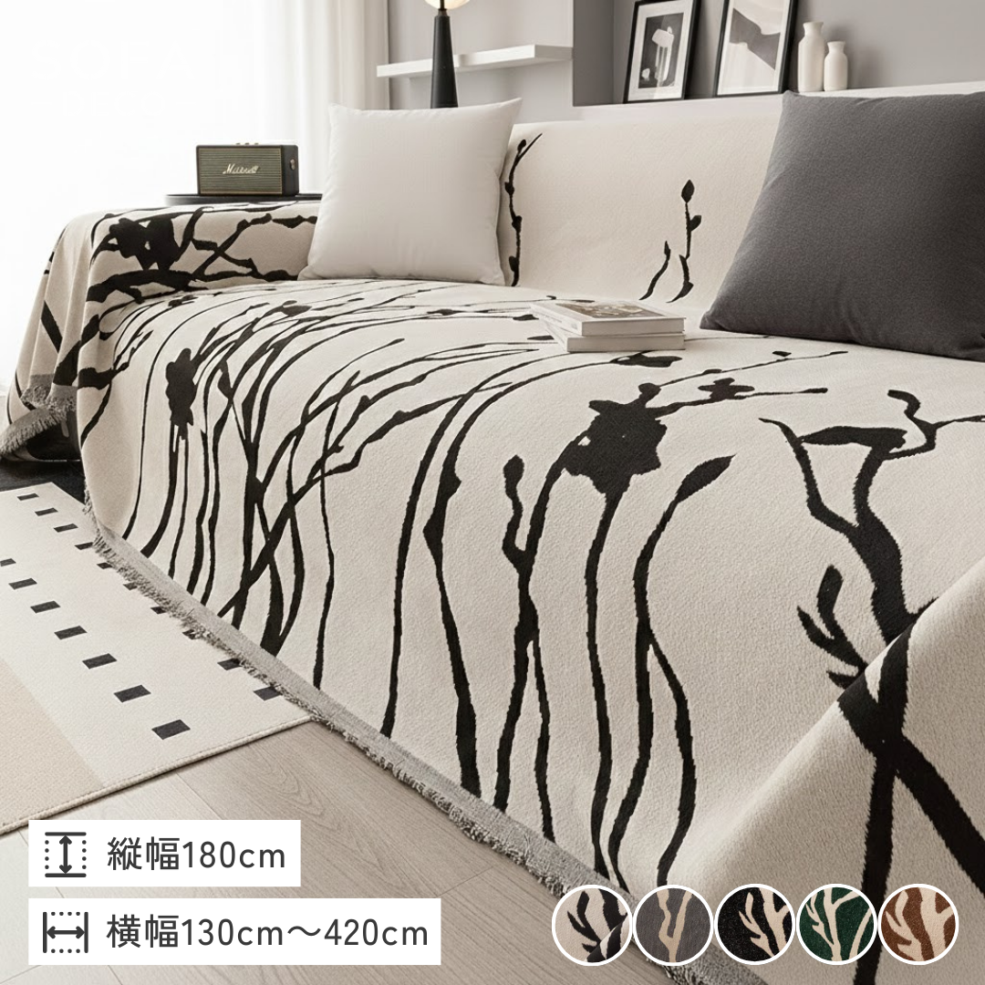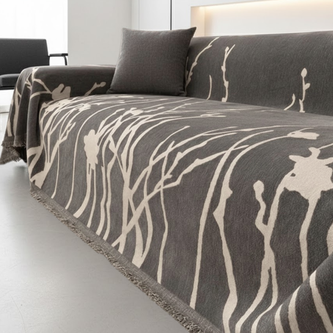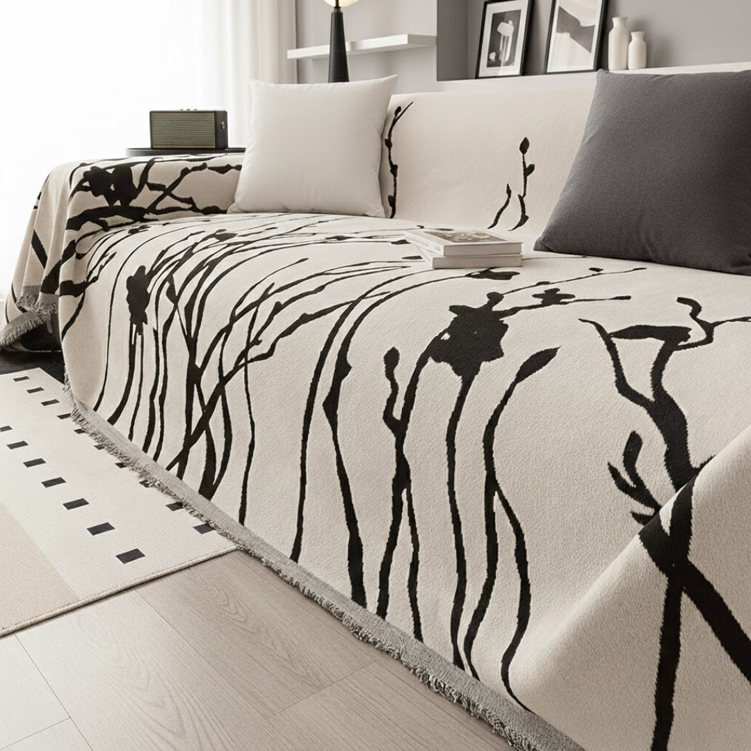 大胆なリーフスケッチが空間に映える、アート感覚のモダンなソファカバー。