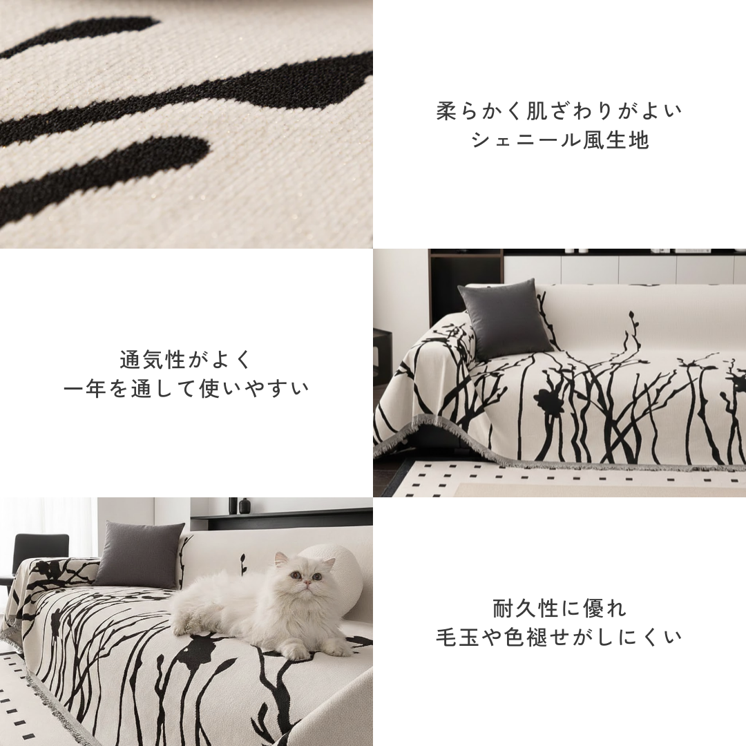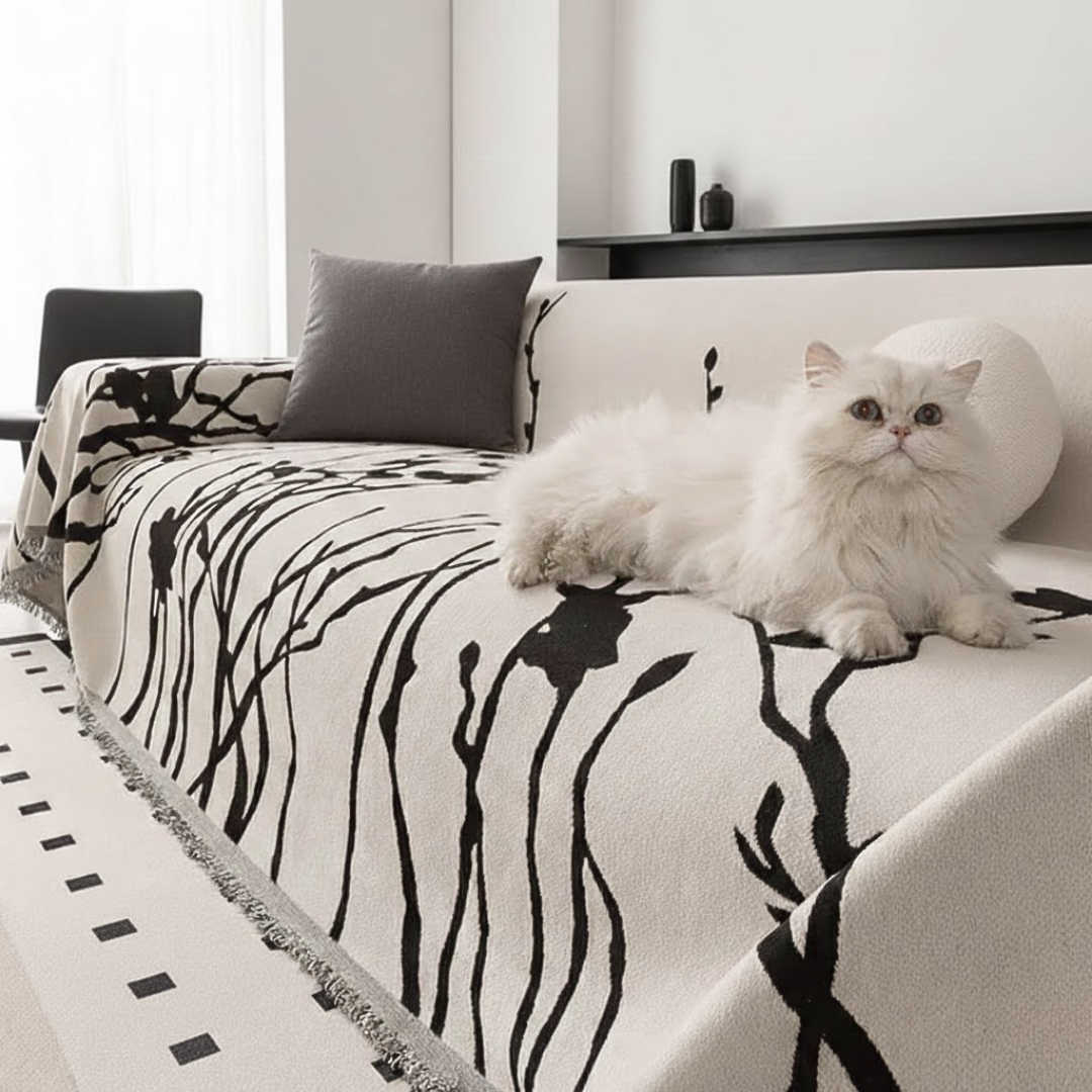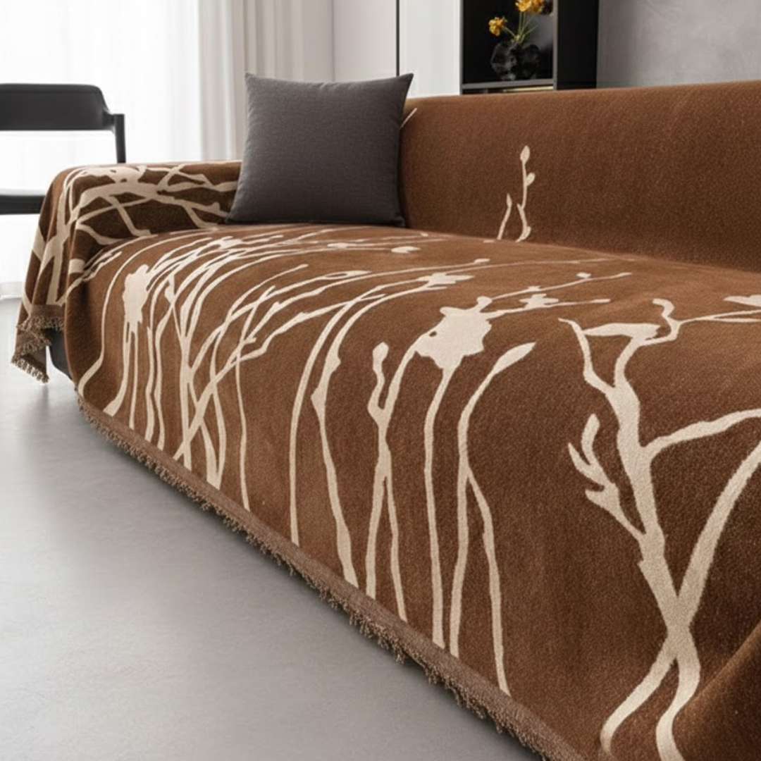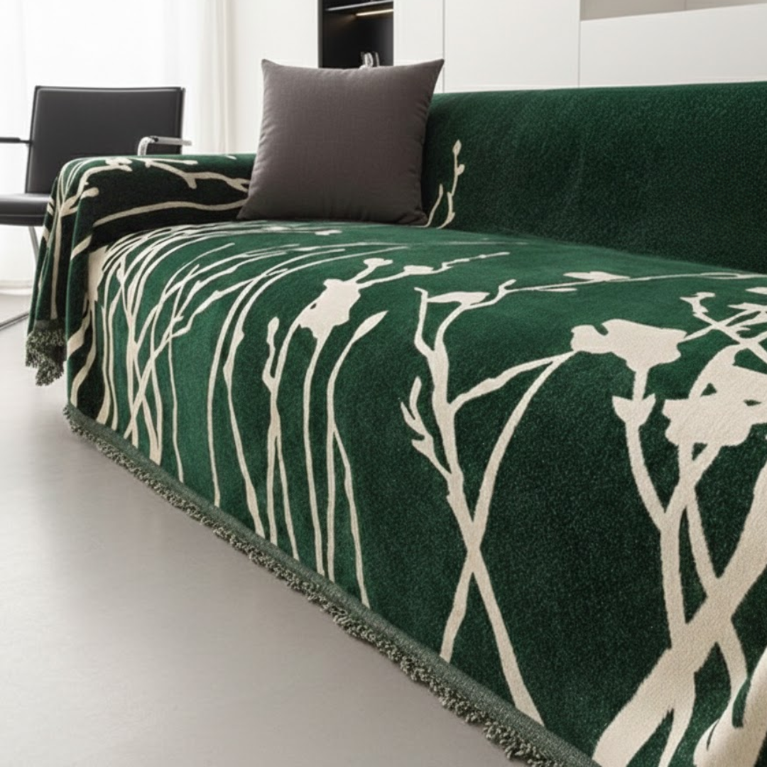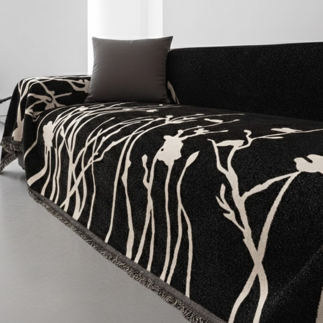 大胆なリーフスケッチが空間に映える、アート感覚のモダンなソファカバー。