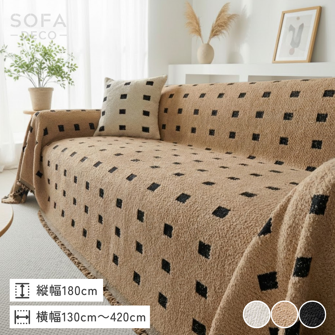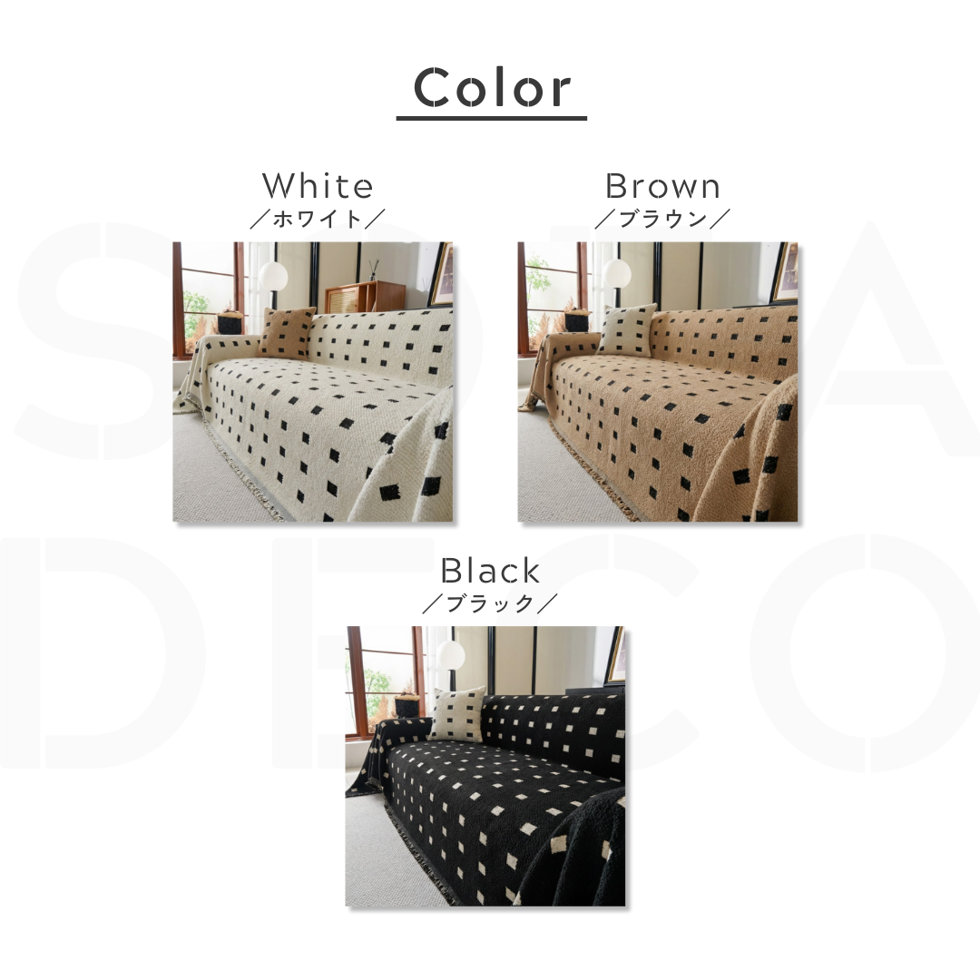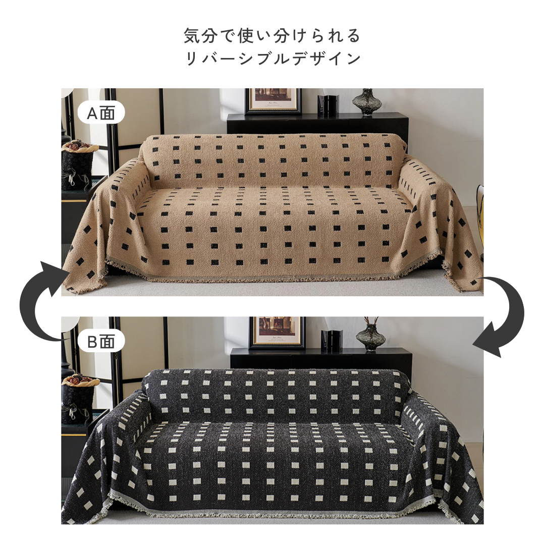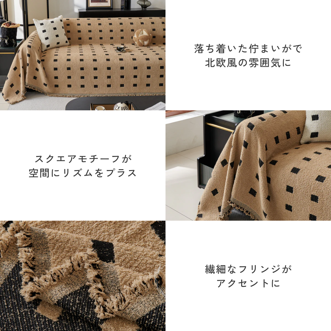 スクエアモチーフが整然と並ぶ、北欧風の佇まいが印象的なソファカバー。