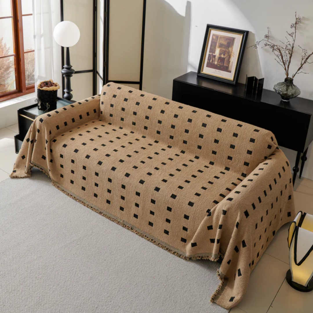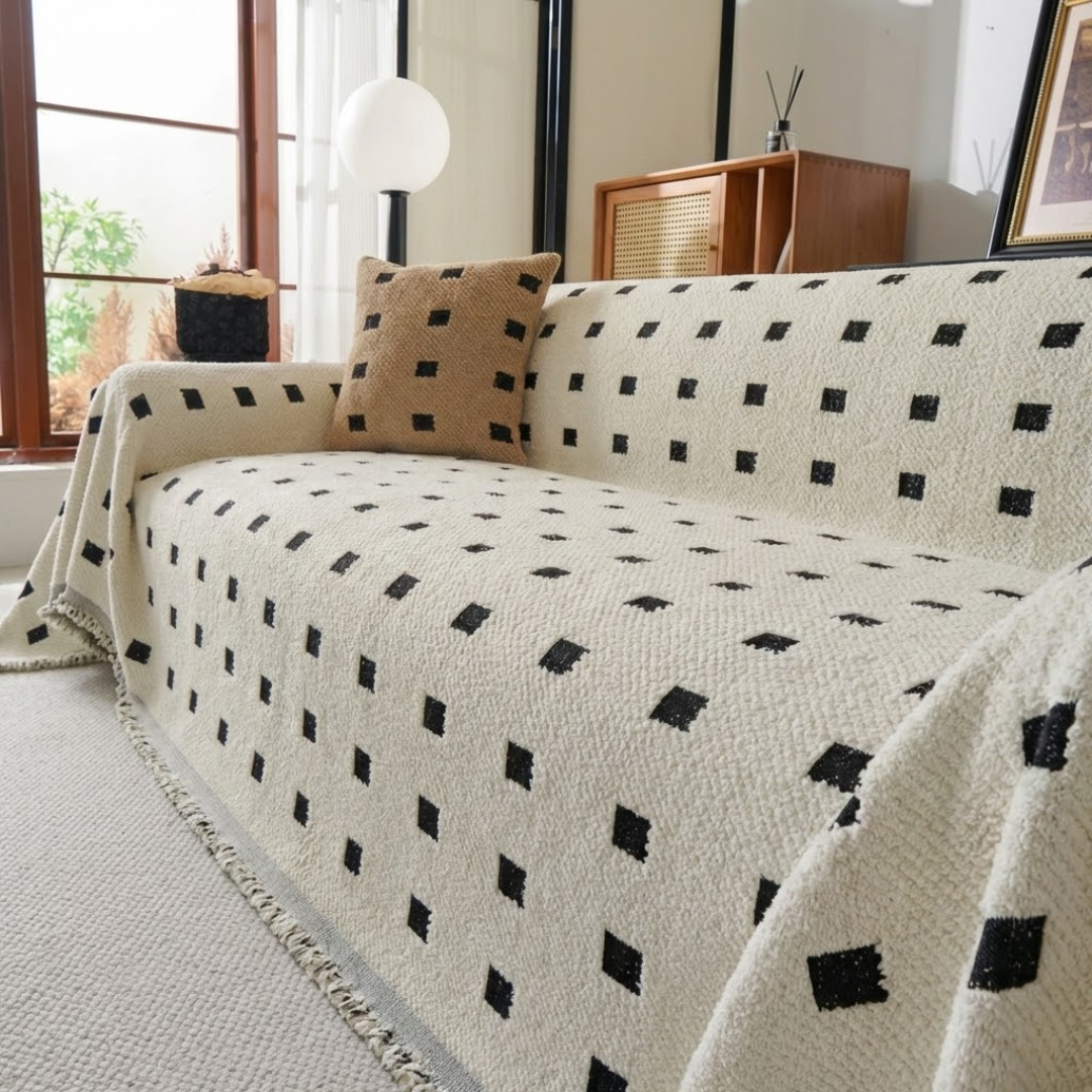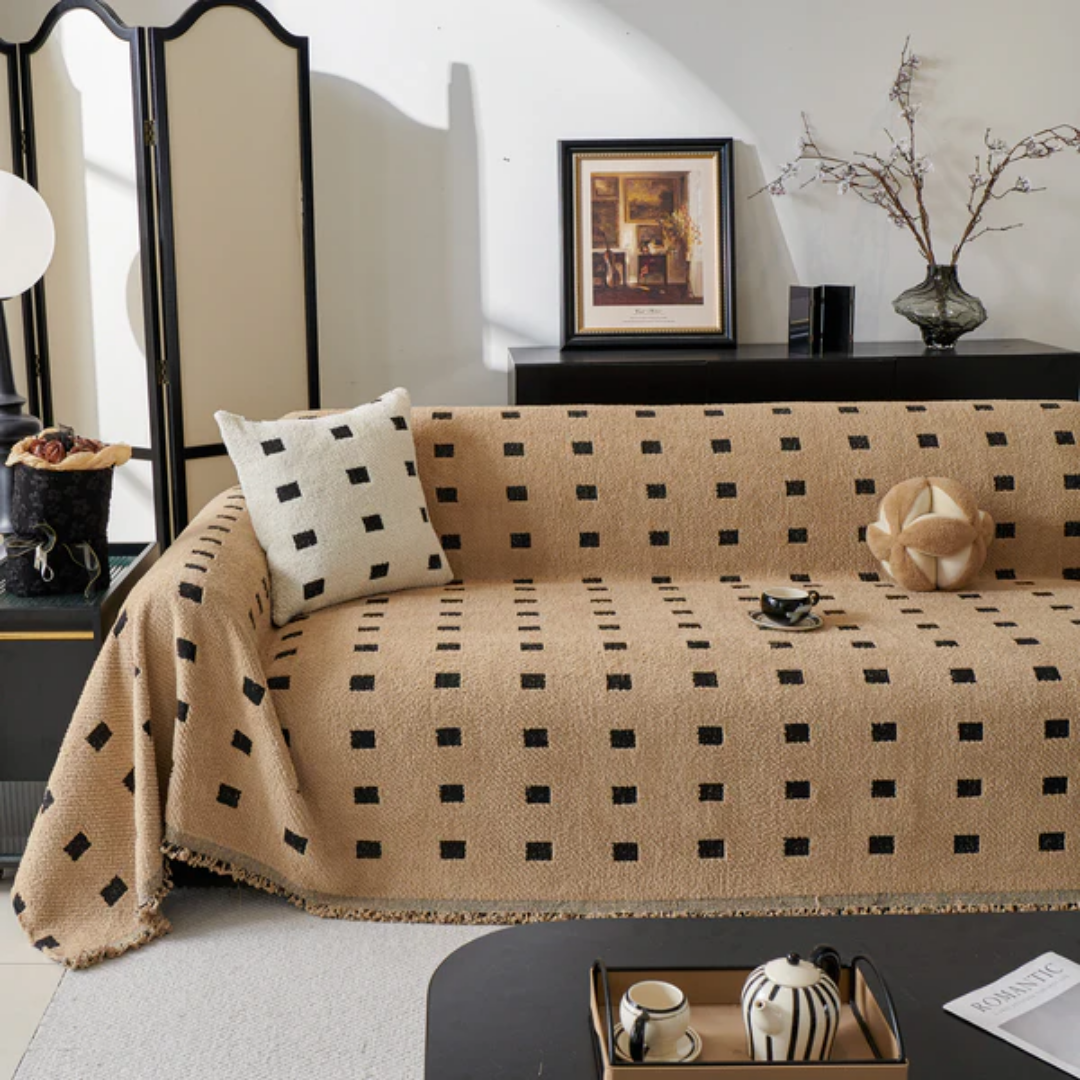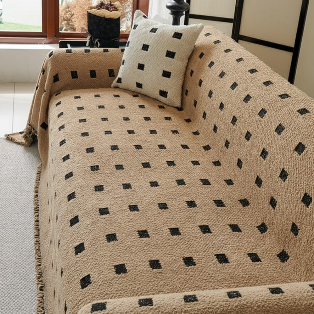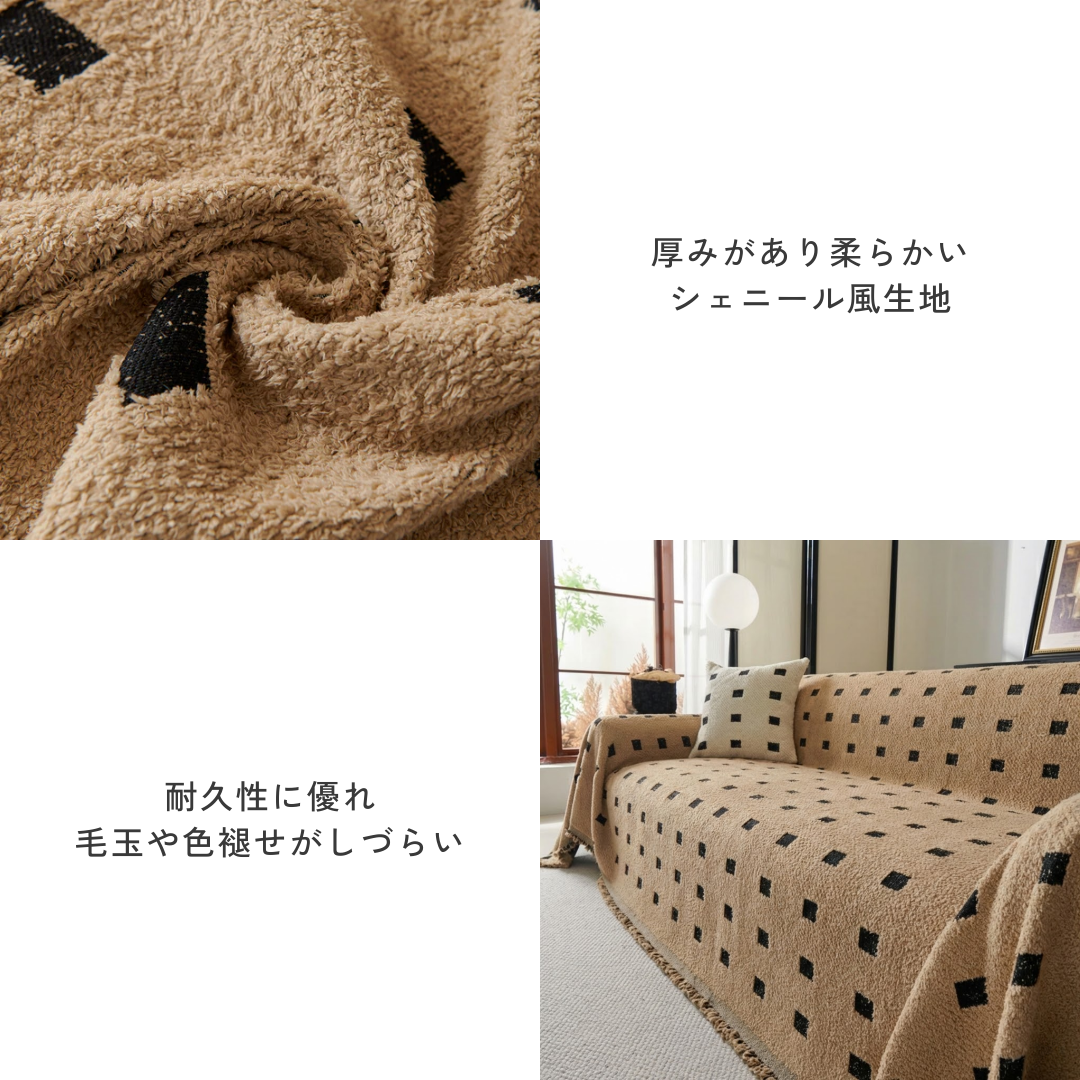 スクエアモチーフが整然と並ぶ、北欧風の佇まいが印象的なソファカバー。