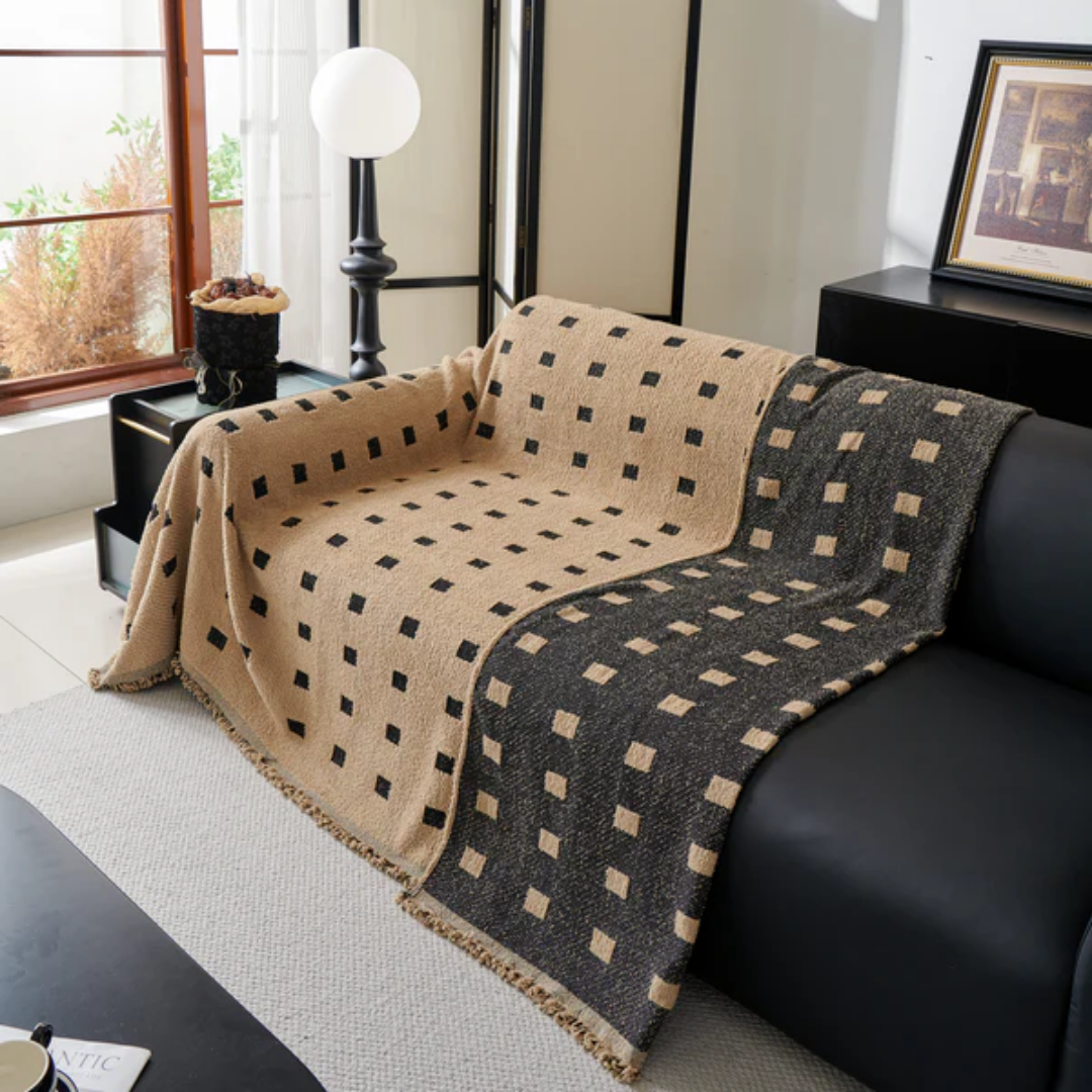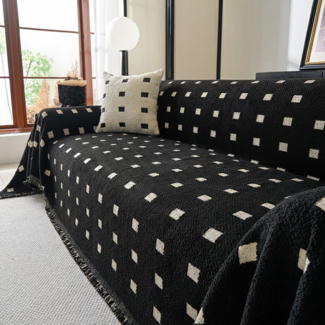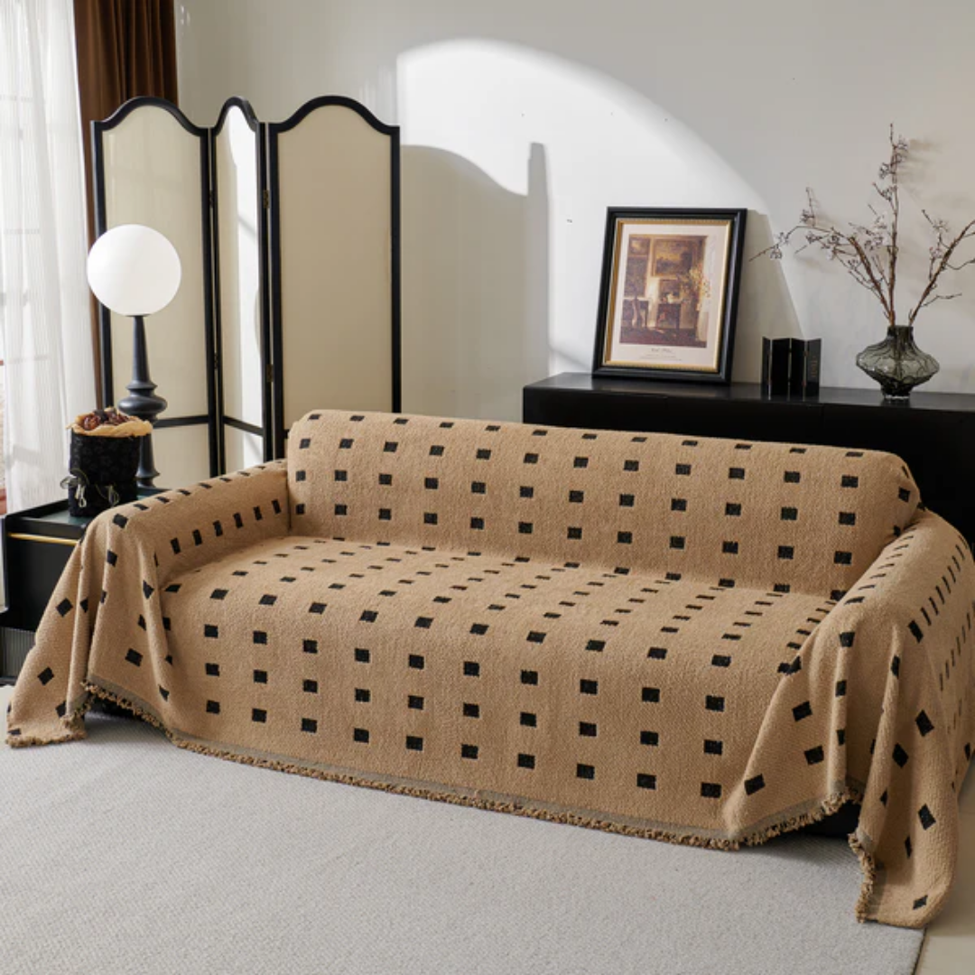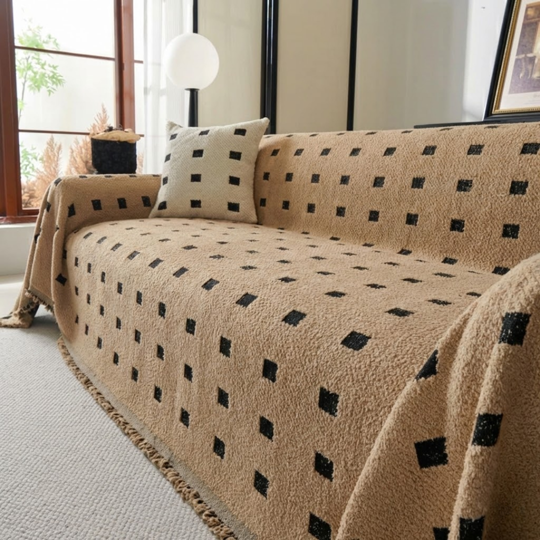 スクエアモチーフが整然と並ぶ、北欧風の佇まいが印象的なソファカバー。