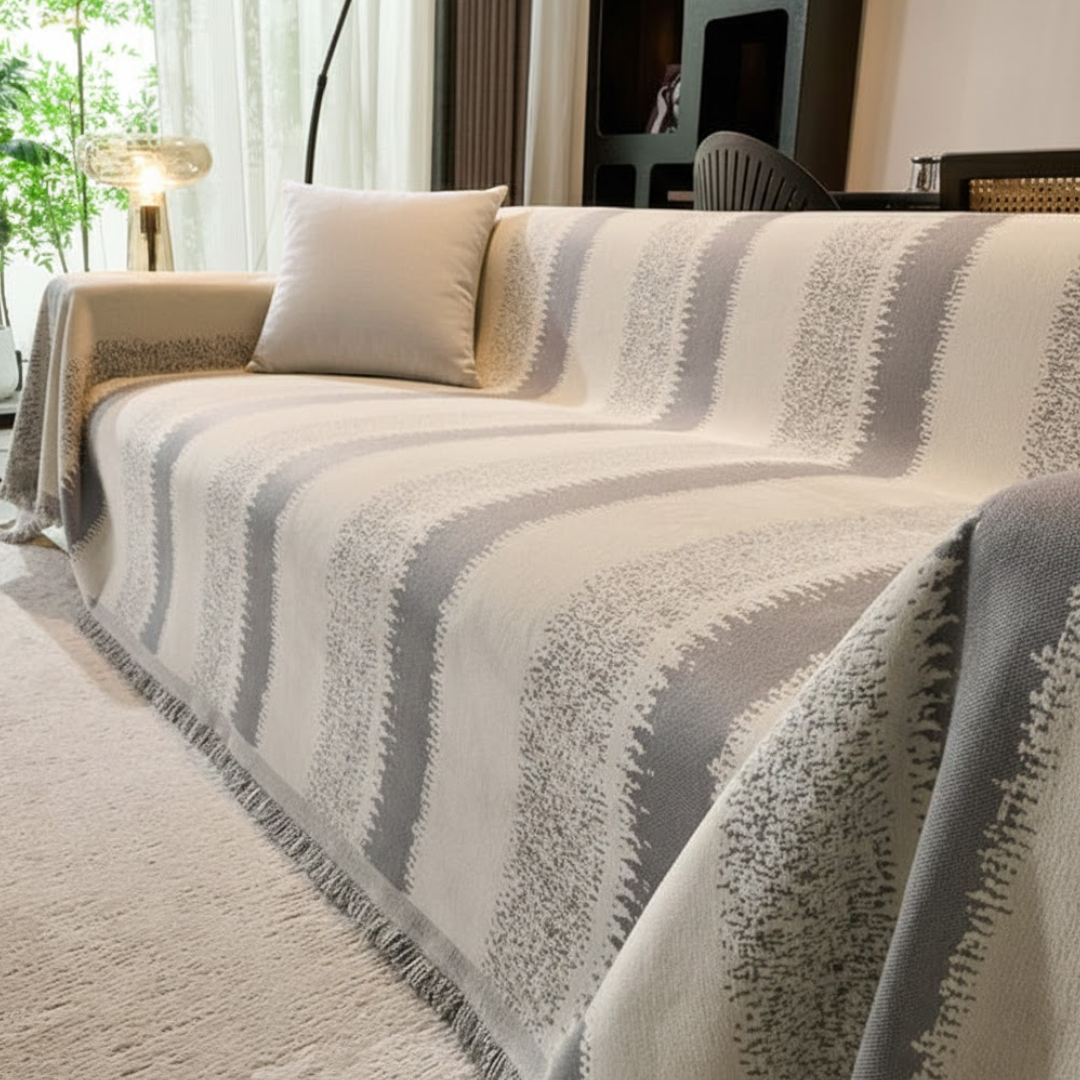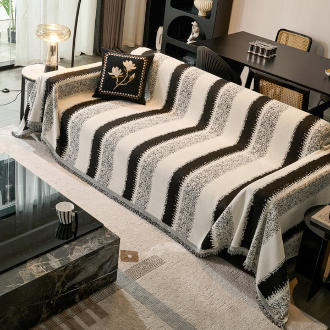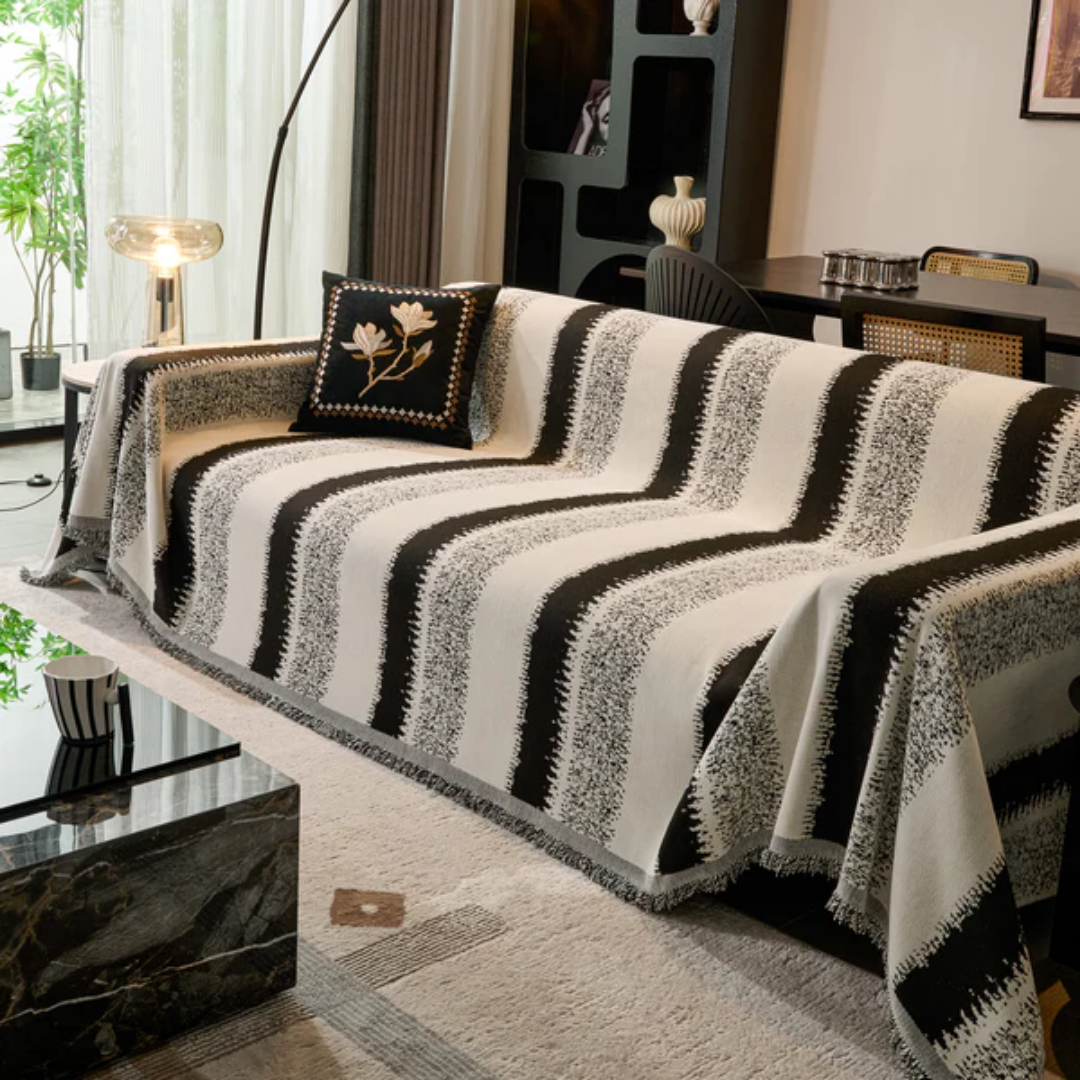 大胆なストライプと繊細なグラデーションが際立つ、空間を引き締めるモダンなソファカバー。