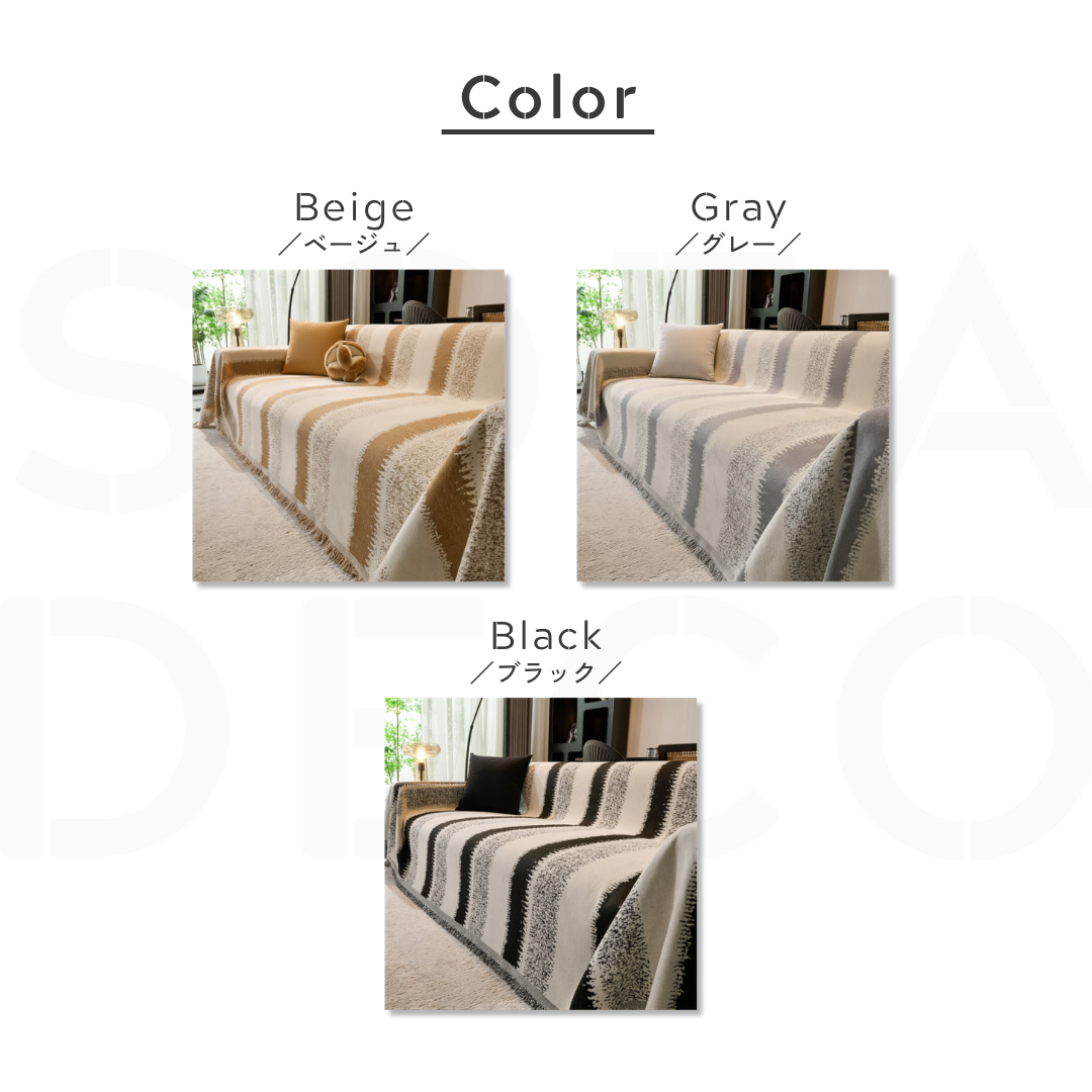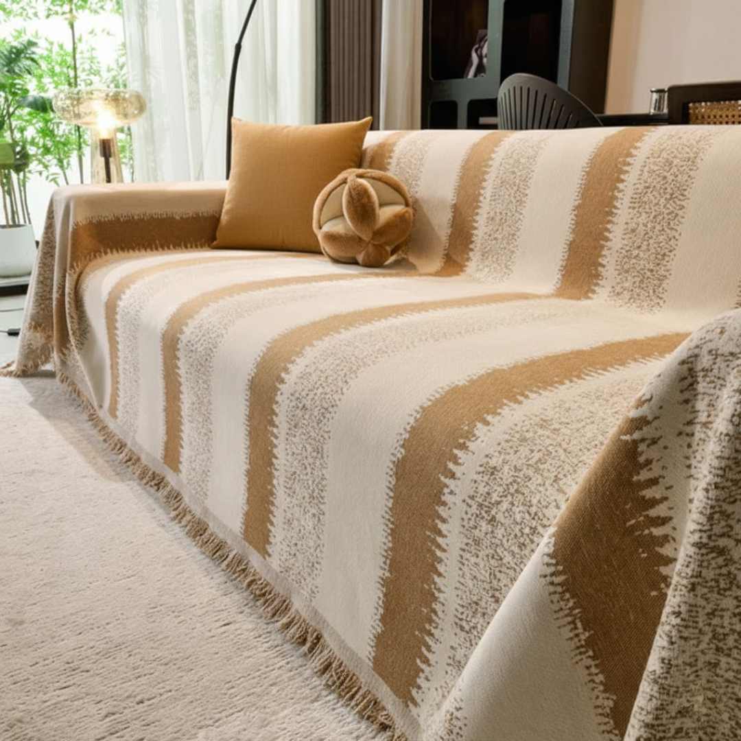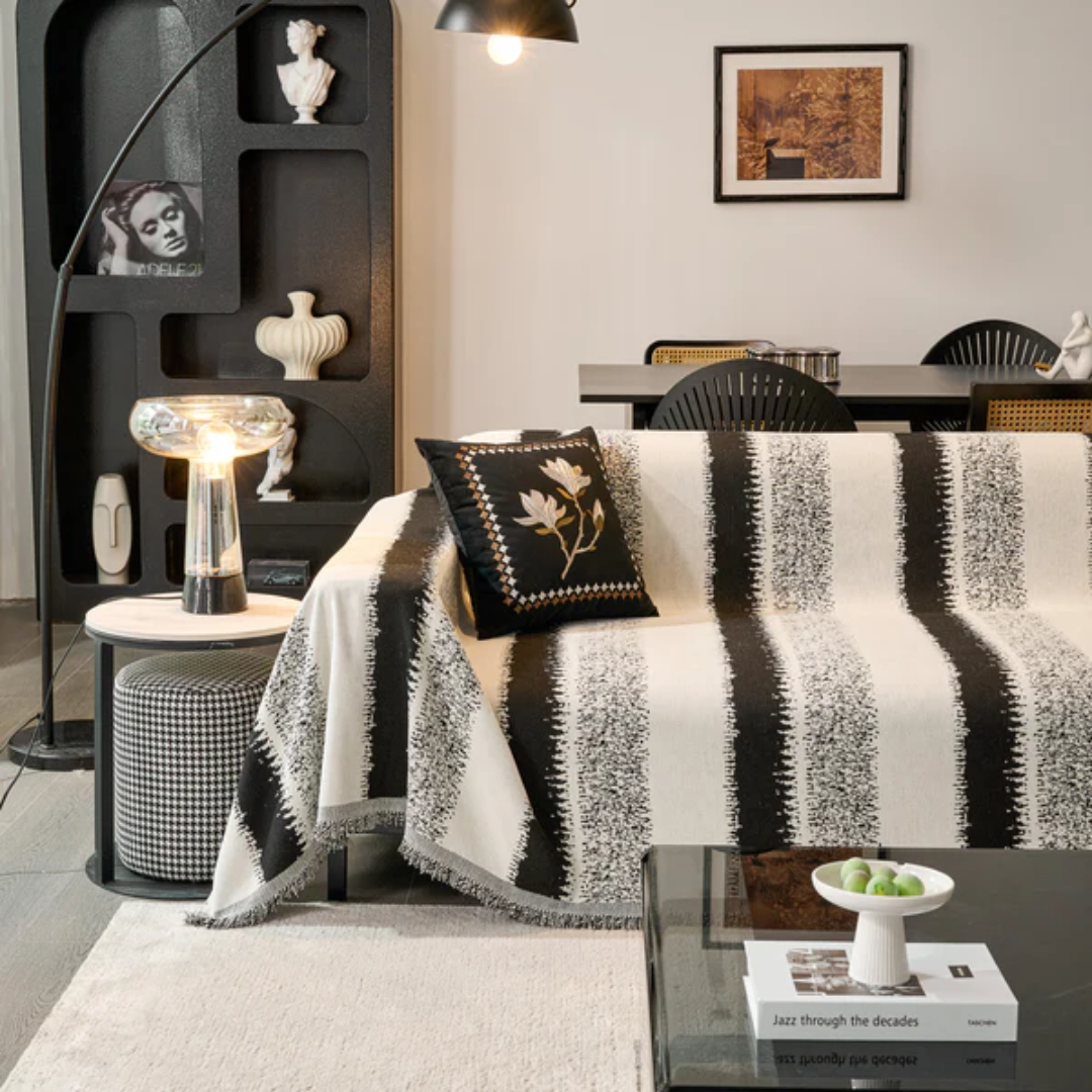 大胆なストライプと繊細なグラデーションが際立つ、空間を引き締めるモダンなソファカバー。