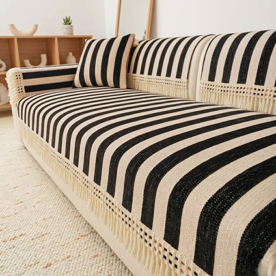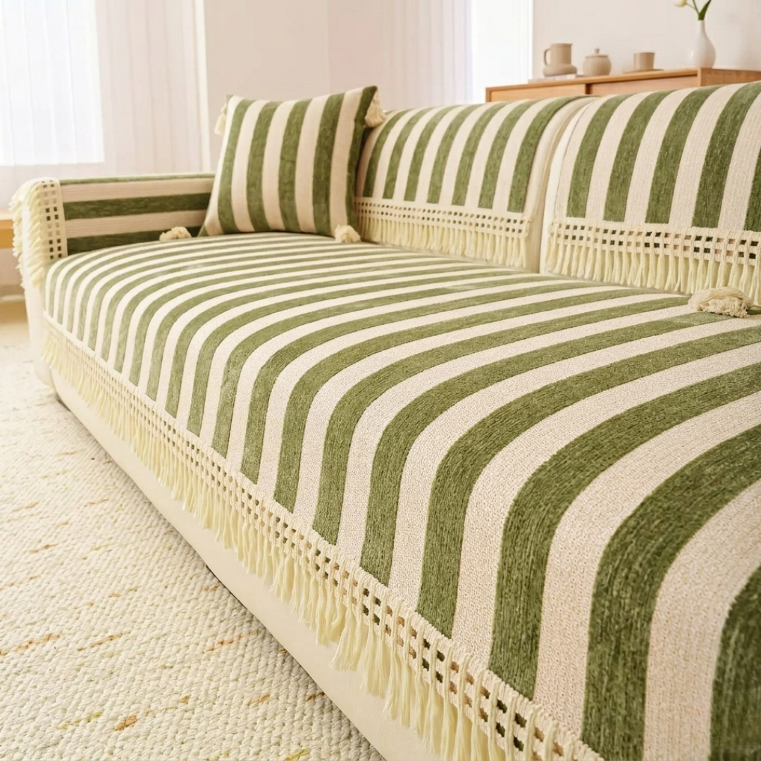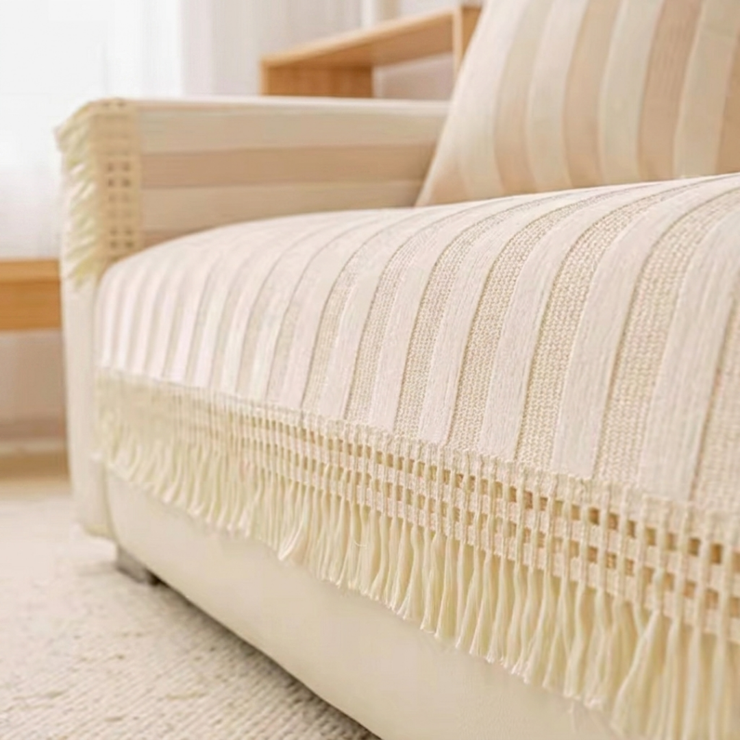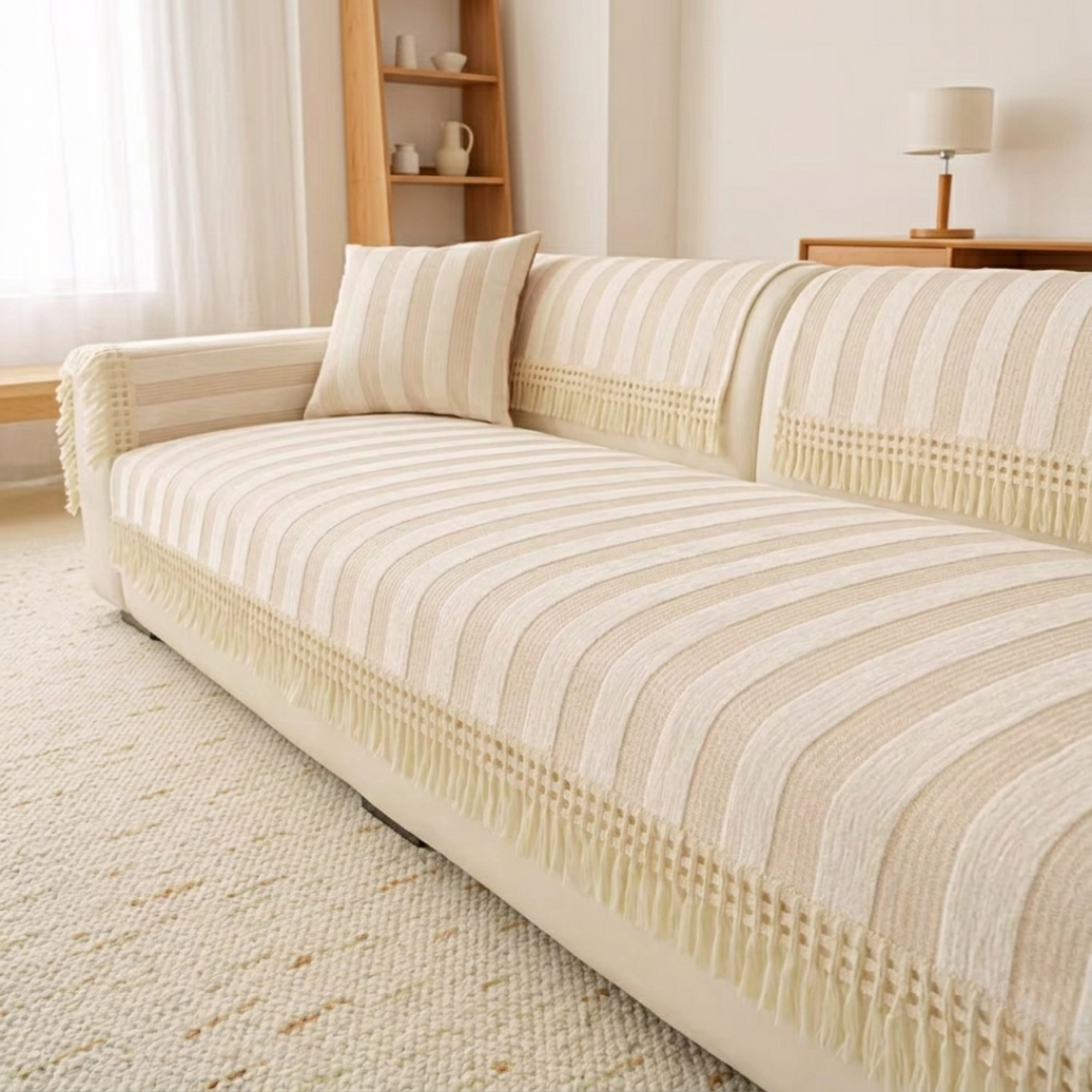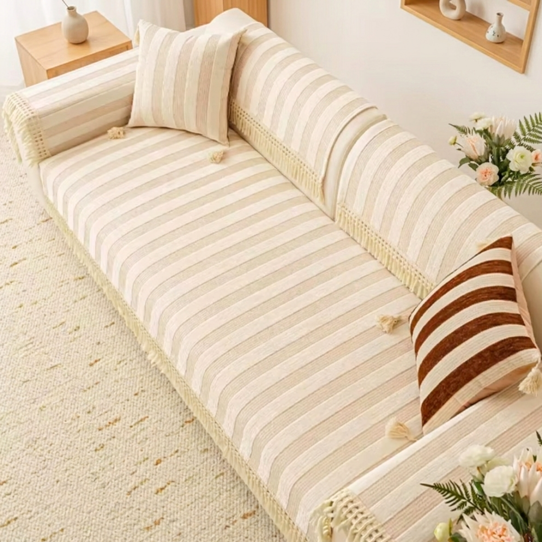 ワイドなストライプが空間に穏やかなリズムをもたらす、やわらかな佇まいのソファカバー。