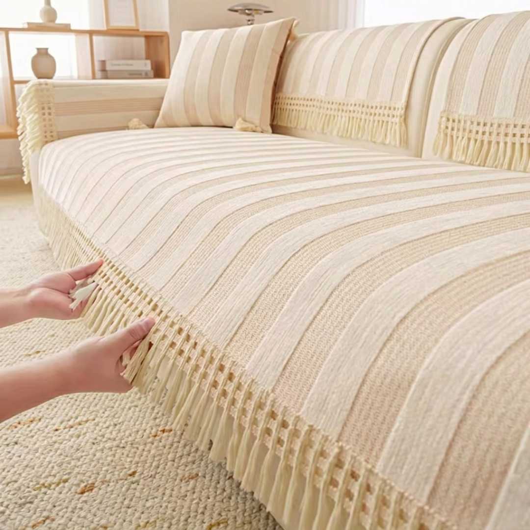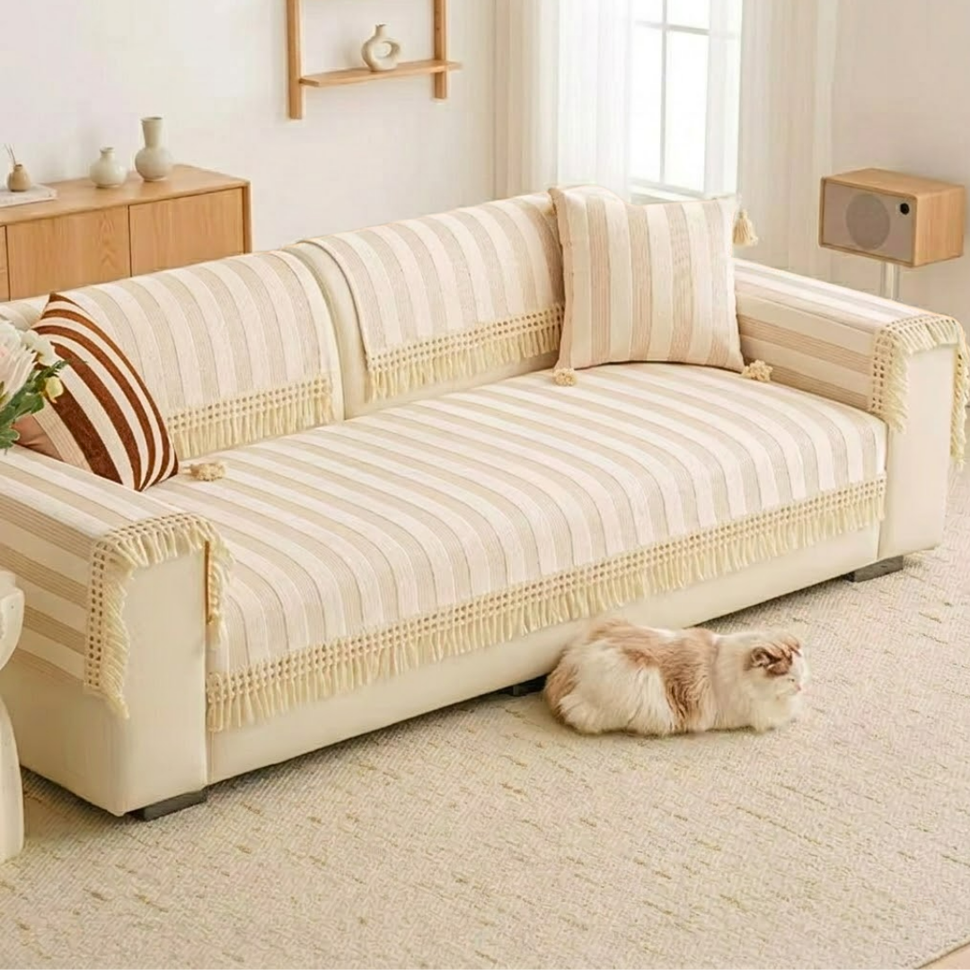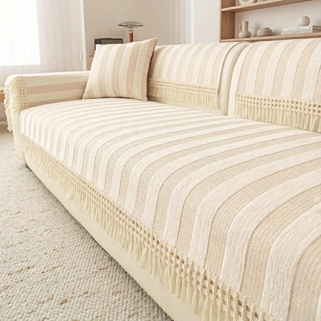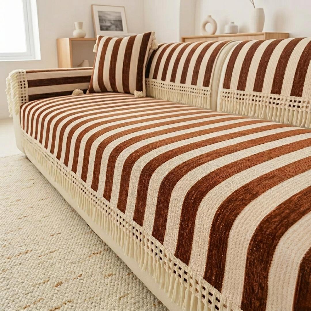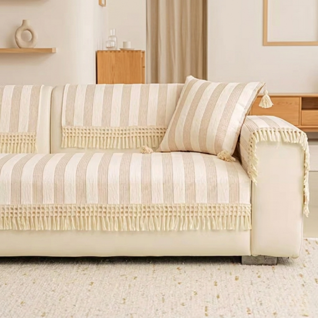 ワイドなストライプが空間に穏やかなリズムをもたらす、やわらかな佇まいのソファカバー。